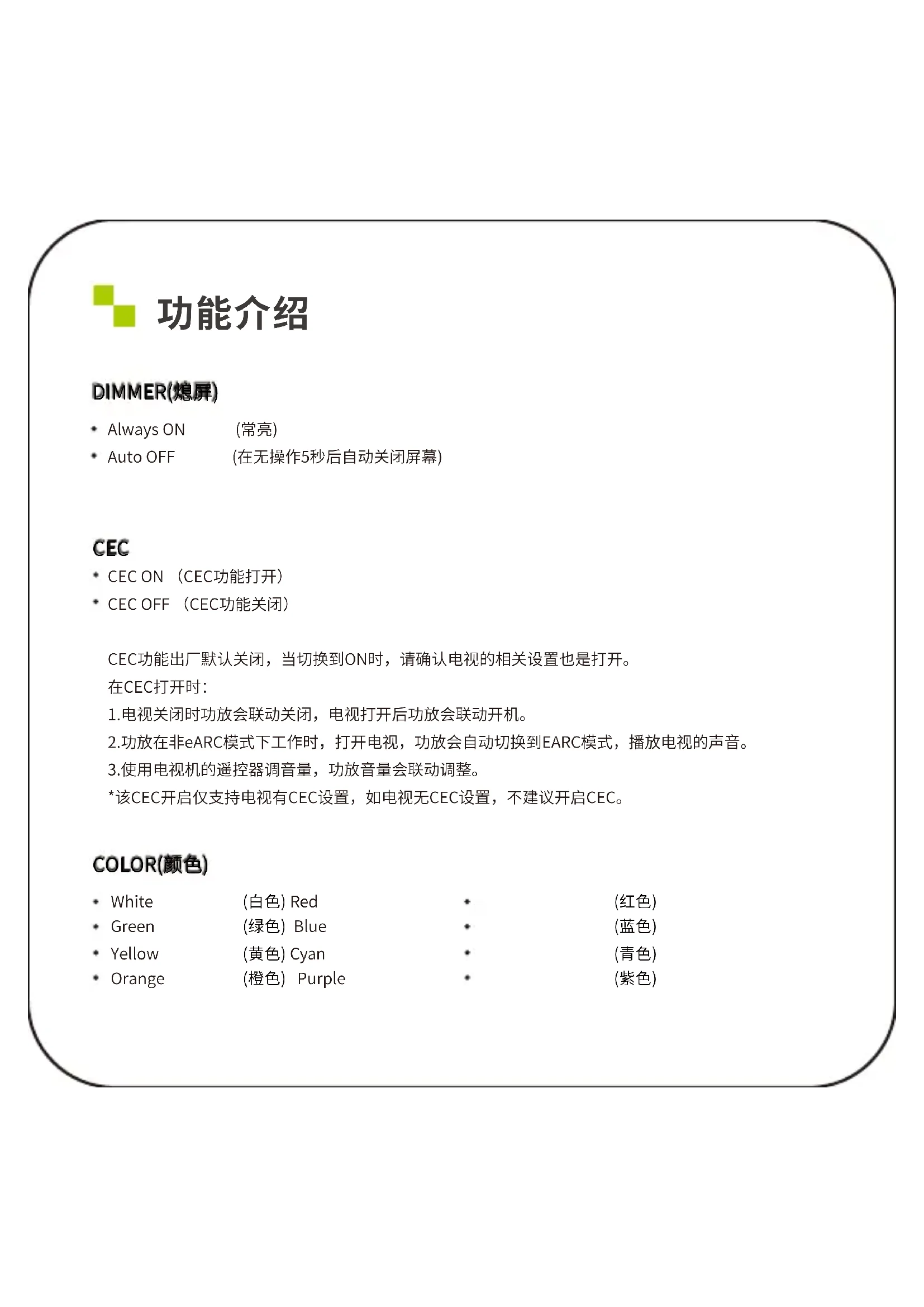 CEC功能出厂默认关闭,当切换到ON时,请确认电视的相关设置也是打开。 在CEC打开时: 1.电视关闭时功放会联动关闭,电视打开后功放会联动开机。 2.功放在非eARC模式下工作时,打开电视,功放会自动切换到EARC模式,播放电视的声音。 3.使用电视机的遥控器调音量,功放音量会联动调整。