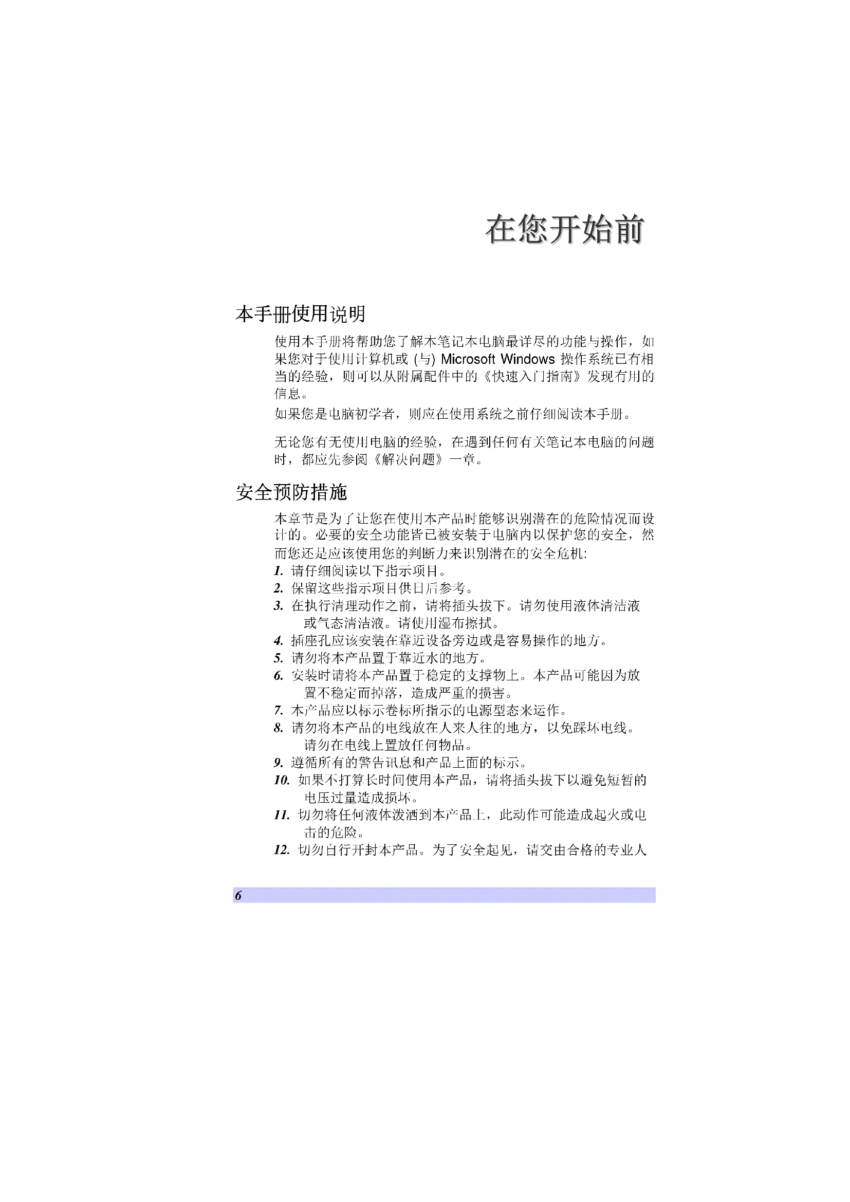 使用本手册将帮助您了解本笔记本电脑最详尽的功能与操作,如 果您对于使用计算机或 (与) Microsoft Windows 操作系统已有相 当的经验,则可以从附属配件中的《快速入门指南》发现有用的