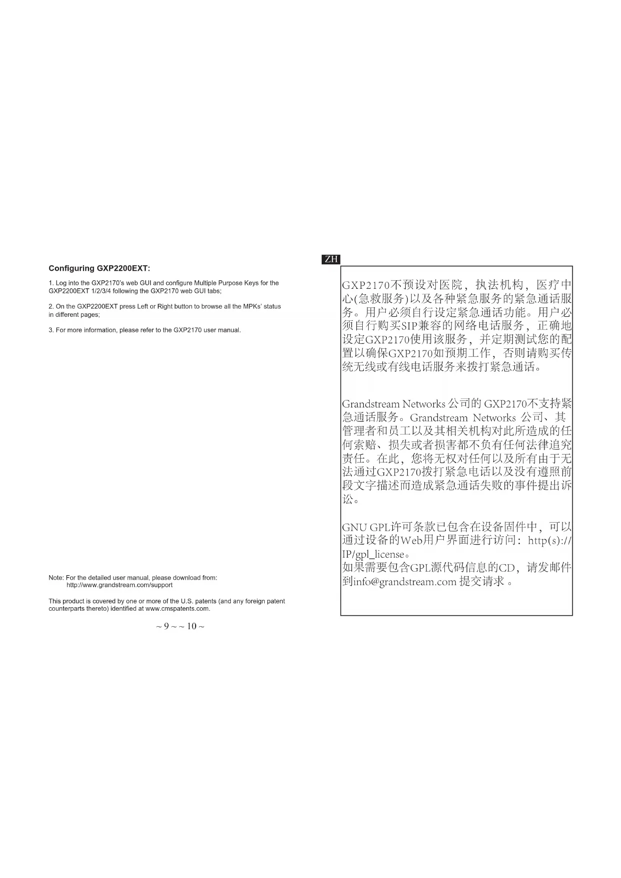 GXP2200EXT:~ 9 ~ ~ 10 ~ Conguring GXP2200EXT: Note: For the detailed user manual, please download from: http://www.grandstream.com/support This product is covered by one or more of the U.S. patents (and any foreign patent counterparts thereto) identied at www.cmspatents.com. GXP2170不预设对医院,执法机构,医疗中 心(急救服务)以及各种紧急服务的紧急通话服 务。用户必须自行设定紧急通话功能。用户必 须自行购买SIP兼容的网络电话服务,正确地 设定GXP2170使用该服务,并定期测试您的配 置以确保GXP2170如预期工作,否则请购买传 统无线或有线电话服务来拨打紧急通话。 Grandstream Networks 公司的 GXP2170不支持紧 急通话服务。Grandstream Networks 公司、其 管理者和员工以及其相关机构对此所造成的任 何索赔、损失或者损害都不负有任何法律追究 责任。在此,您将无权对任何以及所有由于无 法通过GXP2170拨打紧急电话以及没有遵照前 段文字描述而造成紧急通话失败的事件提出诉