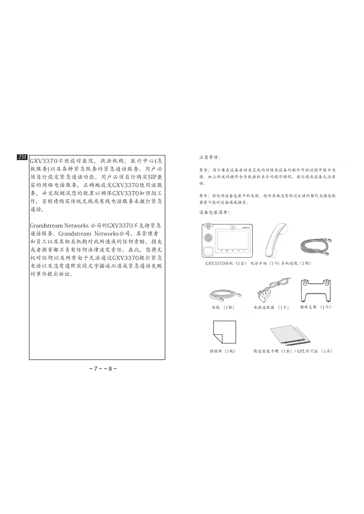警告:请使用设备包装中的电源。使用其他没有经过认证的替代电源适配 器有可能对设备造成损害。 GXV3370话机(1台) 电话手柄(1个) 手柄连线(1根) 网线 (1根) 电源适配器 (1个) 快速安装手册(1本)/ GPL许可证 (1本) 墙体支架 (1个) 擦镜布(1块) 12V GXV3370不预设对医院,执法机构,医疗中心(急 救服务)以及各种紧急服务的紧急通话服务。用户必 须自行设定紧急通话功能。用户必须自行购买SIP兼 容的网络电话服务,正确地设定GXV3370使用该服 务,并定期测试您的配置以确保GXV3370如预期工 作,否则请购买传统无线或有线电话服务来拨打紧急