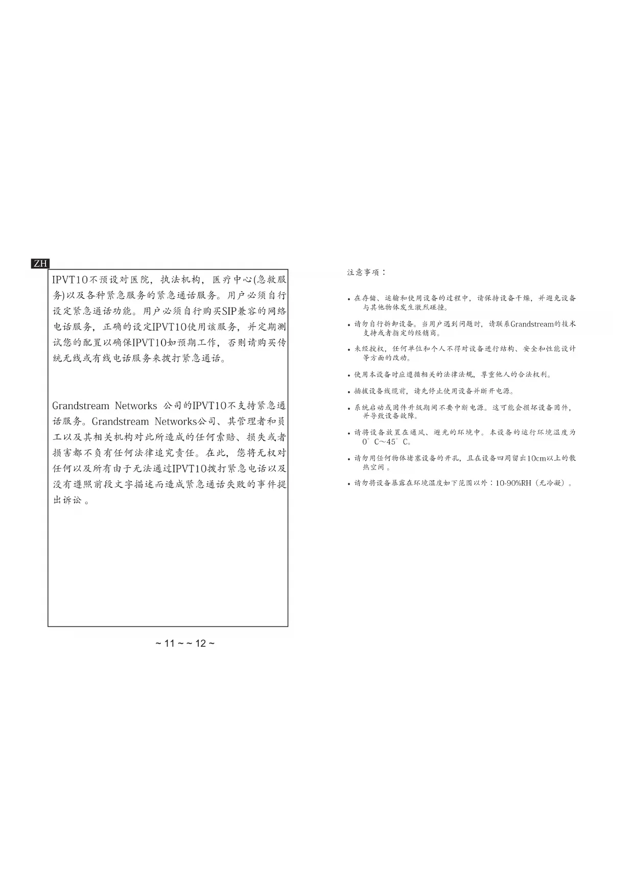 Grandstream Networks 公司的IPVT10不支持紧急通话服务。Grandstream Networks公司、其管理者和员工以及其相关机构对此所造成的任何索赔、损失或者损害都不负有任何法律追究责任。在此,您将无权对任何以及所有由于无法通过IPVT10拨打紧急电话以及没有遵照前段文字描述而造成紧急通话失败的事件提出诉讼。