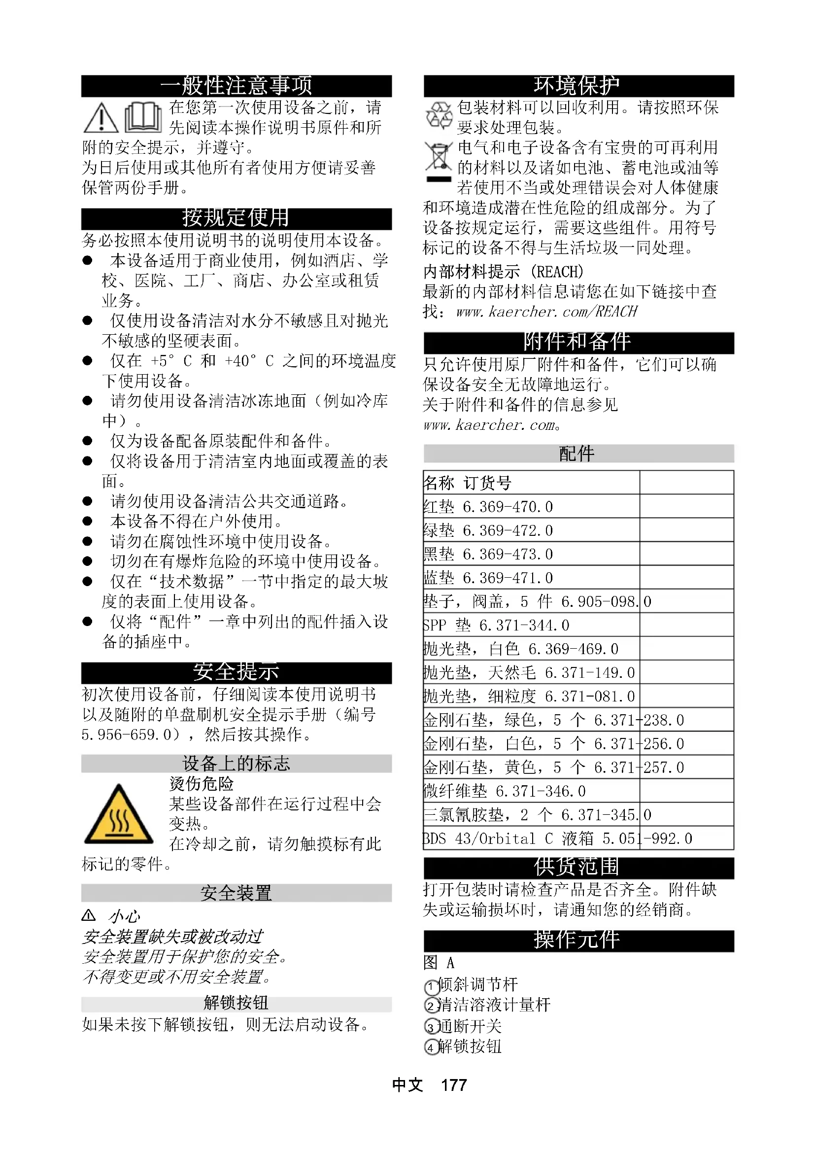 初次使用设备前,仔细阅读本使用说明书 以及随附的单盘刷机安全提示手册(编号 5.956-659.0),然后按其操作。