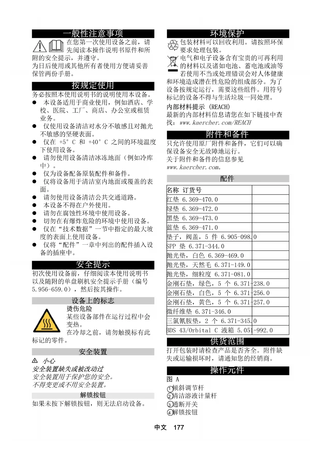 初次使用设备前,仔细阅读本使用说明书 以及随附的单盘刷机安全提示手册(编号 5.956-659.0),然后按其操作。