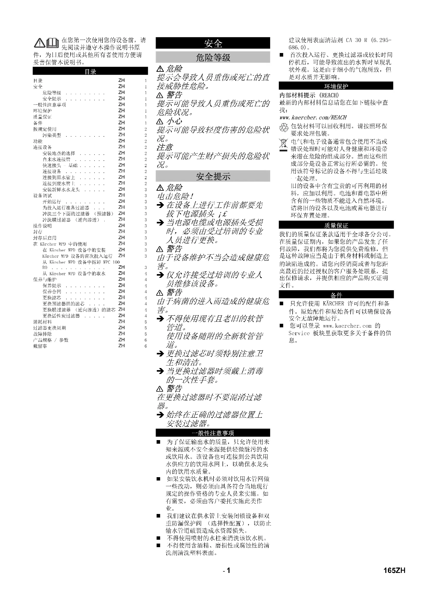– 羊绒过滤器 (清除粗污垢颗粒) – 活性炭过滤器 (颗粒) – 活性炭过滤器 (块状) – 膜过滤器 (逆向渗透) – 活性炭过滤器 (确保中性口味) 整个过滤系统必须定期更换。 在第一次安装和可能涉及到更换配件的 维修作业中,必须确保只能使用附属的 部件。这些部件指的是 KÄRCHER 准许用 于安装的部件。不允许使用其他部件。 电源连接和水源输入压力必须符合技术