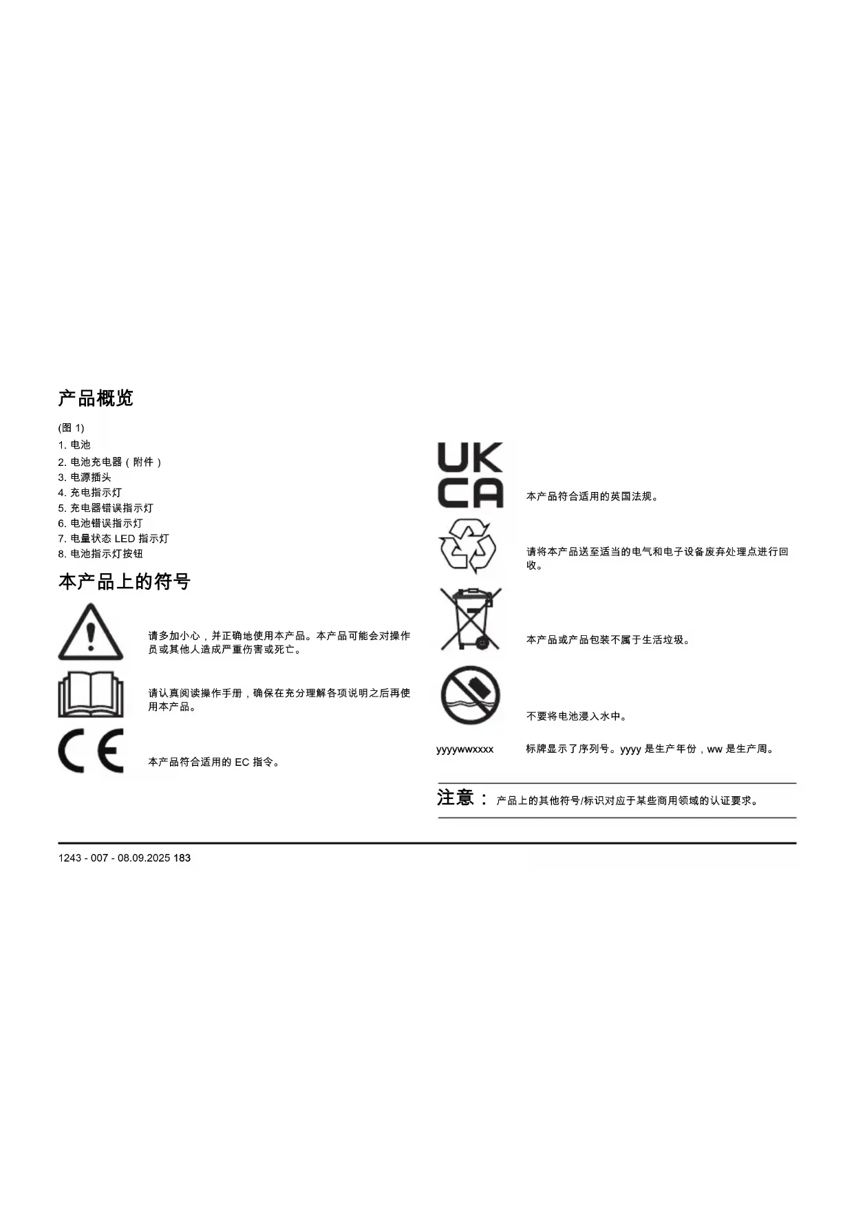 该指示器显示电池的电量状态以及电池是否出现问题。 1243 - 007 - 08.09.2025 185指示灯 电池(电量)状态 4 个指示灯亮起 电池的电量为 76% - 100%。 3 个指示灯亮起 电池的电量为 51% - 75%。 2 个指示灯亮起 电池的电量为 26% - 50%。 1 个指示灯亮起 电池的电量为 6% - 25%。 1 个指示灯闪烁 电池的电量为 0% - 5%。