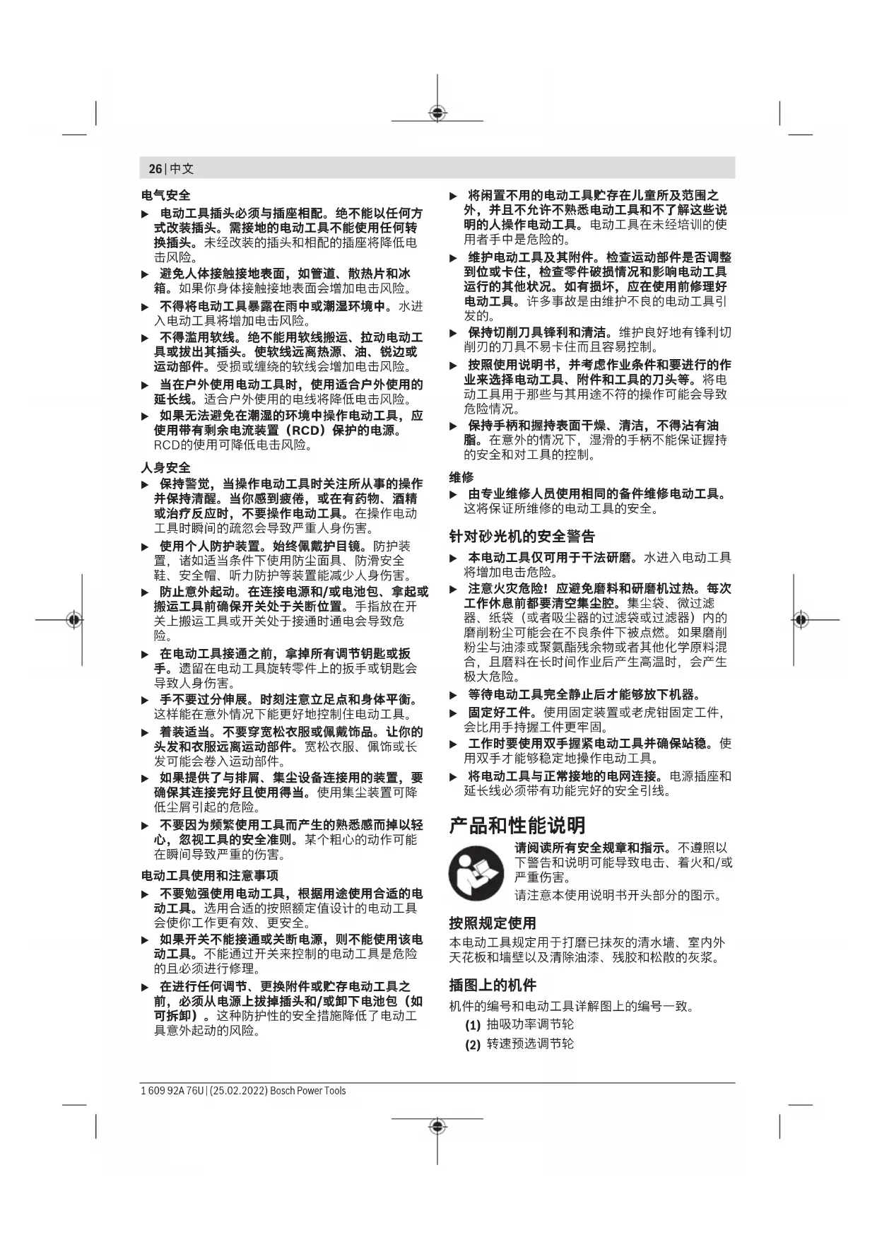 Bosch Power Tools 1 609 92A 76U | (25.02.2022)32 | 繁體中文 u 在電動工具接通之前,拿掉所有調節鑰匙或扳 手。遺留在電動工具旋轉零件上的扳手或鑰匙會