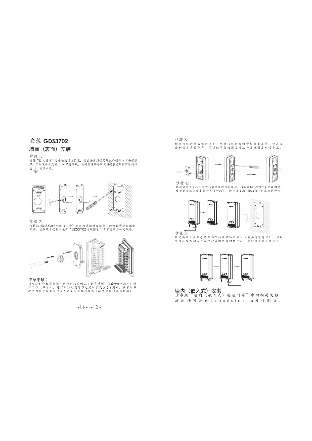 请参照“墙内(嵌入式)安装附件”中的相关文档。 该附件可以向Grandstream另行购买。~13~ ~14~ GDS3702 连接方法 请参照下图以及后面几页的操作说明。