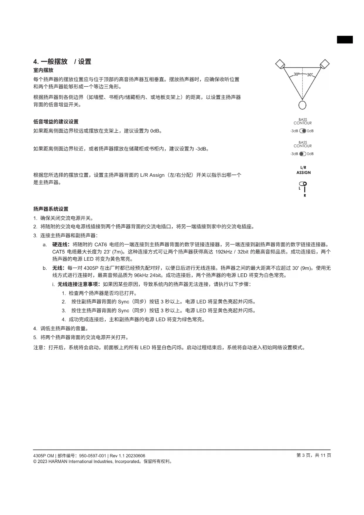 b. 无线:每一对4305P在出厂时都已经预先配对好,以便日后进行无线连接。扬声器之间的最大距离不应超过 30^(9m) 。使用无线方式进行连接时,最高音频品质为 96kHz24bit 。成功连接后,两个扬声器的电源LED将变为白色常亮。