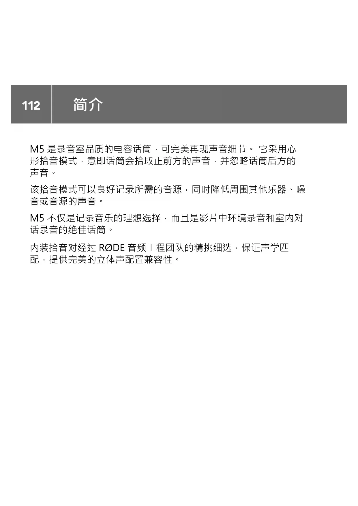 M5_multilingual_manual.indb 111M5_multilingual_manual.indb 111 2/09/2013 7:00:16 PM2/09/2013 7:00:16 PM112 M5 是录音室品质的电容话筒,可完美再现声音细节。 它采用心 形拾音模式,意即话筒会拾取正前方的声音,并忽略话筒后方的