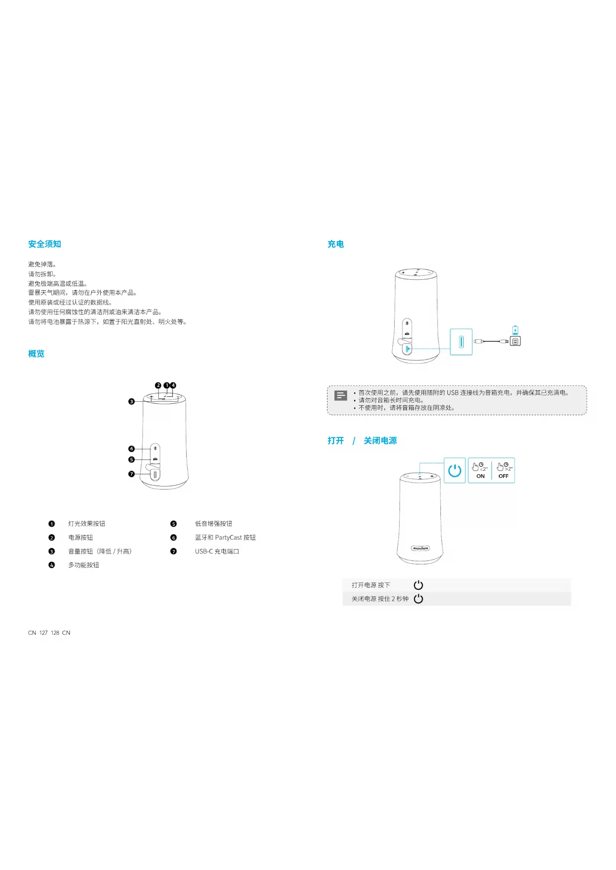 - 首次使用之前,请先使用随附的 USB 连接线为音箱充电,并确保其已充满电。