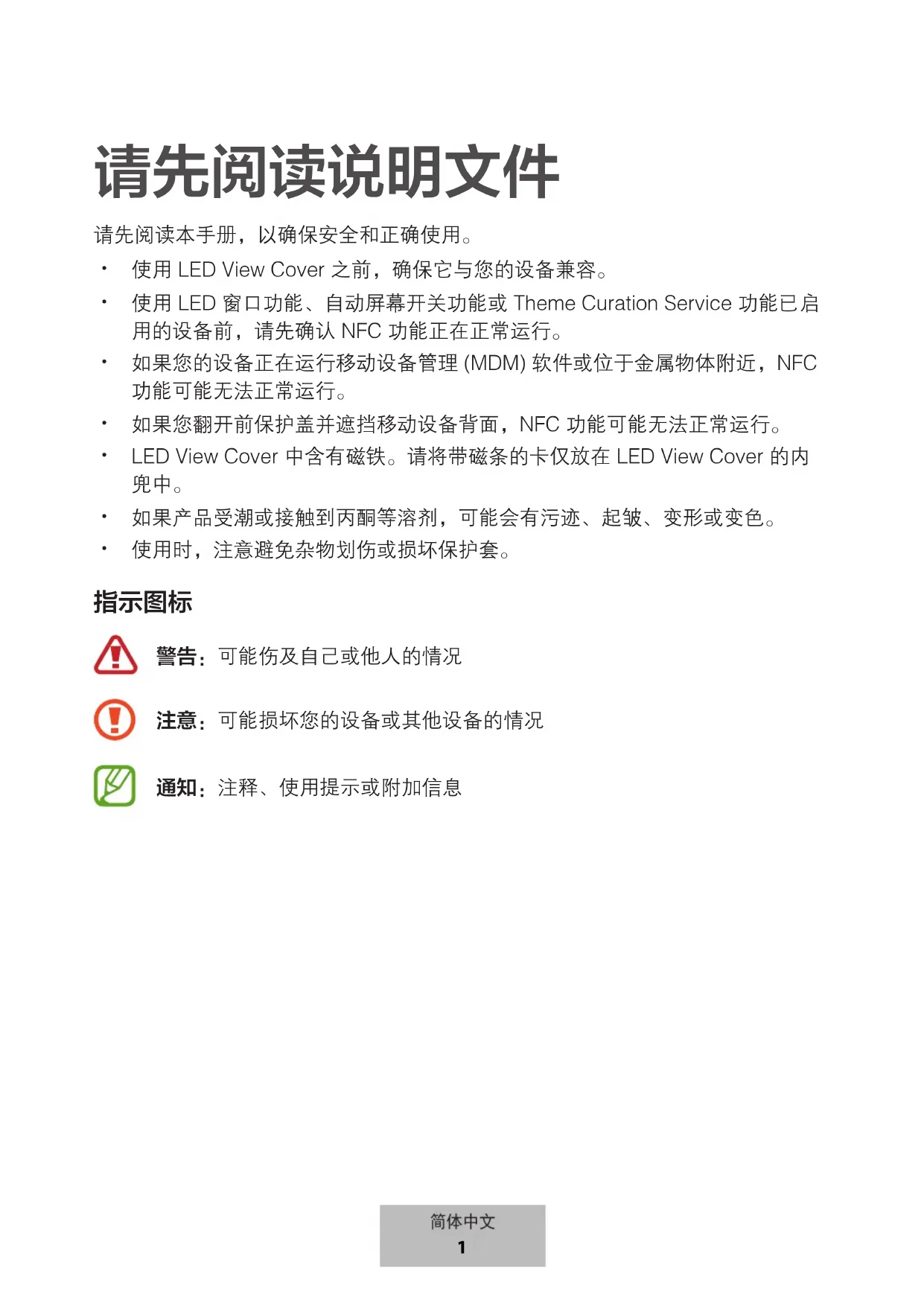 使用LED窗口功能、自动屏幕开关功能或ThemeCurationService功能已启 用的设备前,请先确认NFC功能正在正常运行。