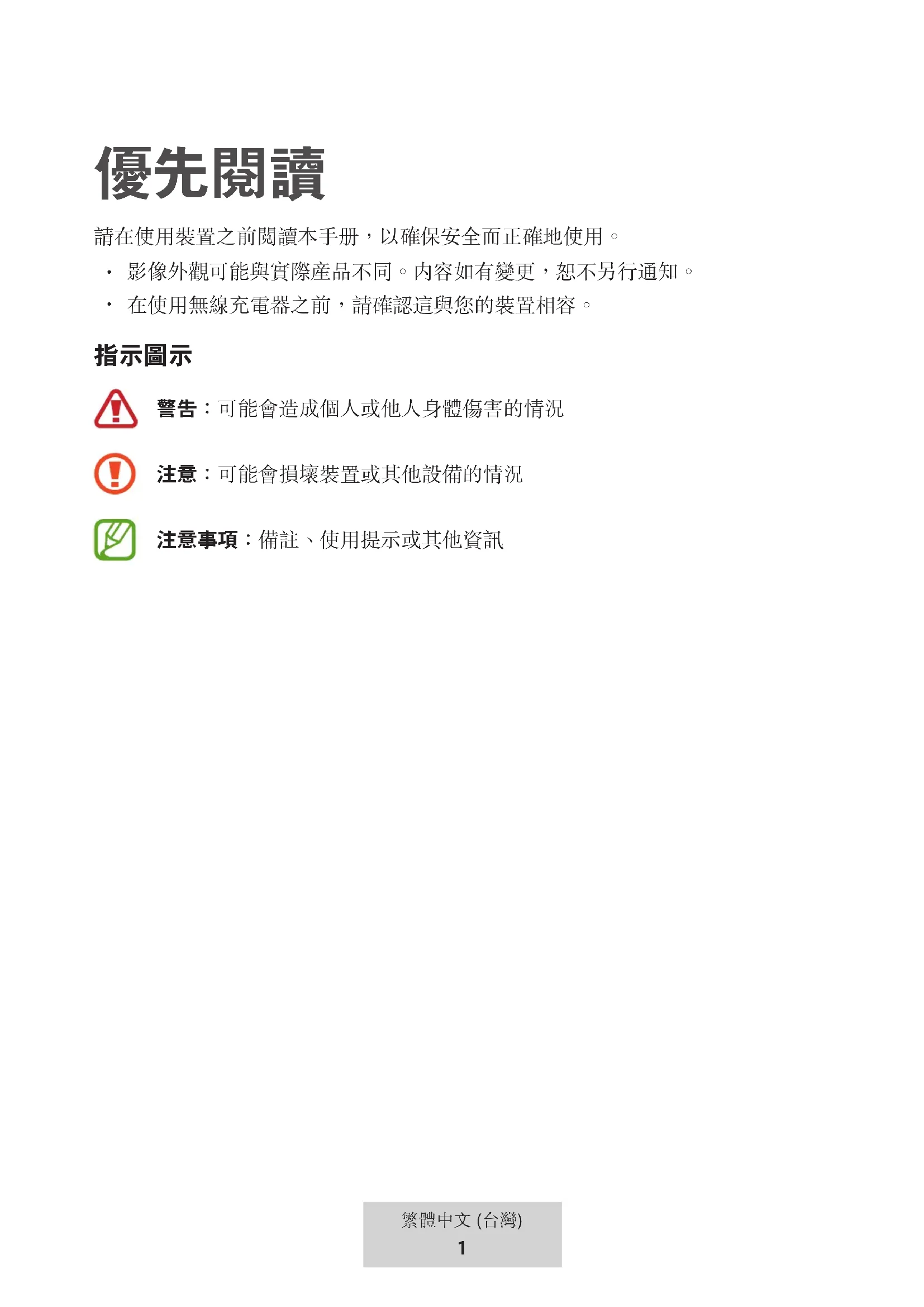 警告:可能會造成個人或他人身體傷害的情況 注意:可能會損壞裝置或其他設備的情況 注意事項:備註、使用提示或其他資訊2