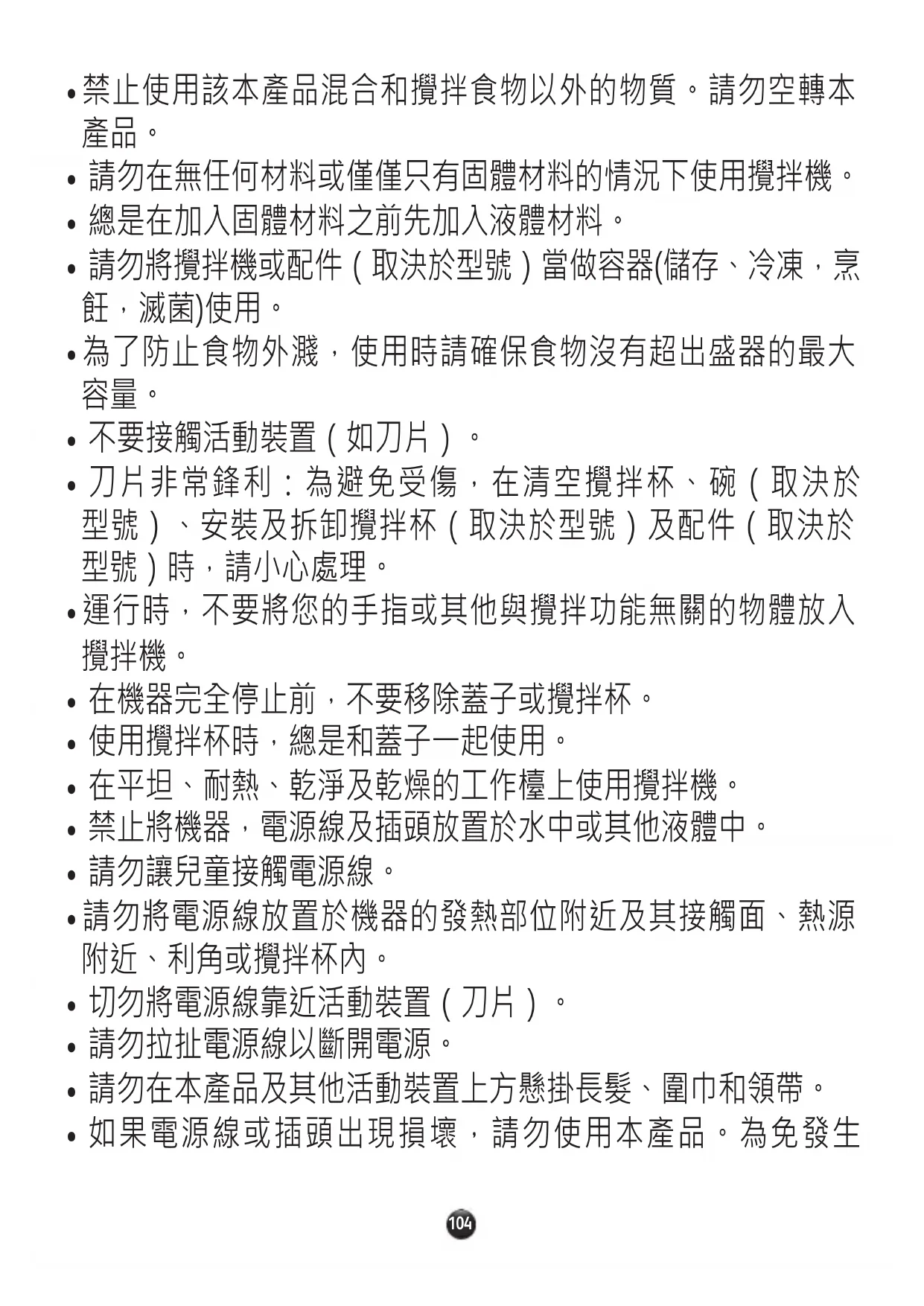 - 禁止使用該本產品混合和攪拌食物以外的物質。請勿空轉本