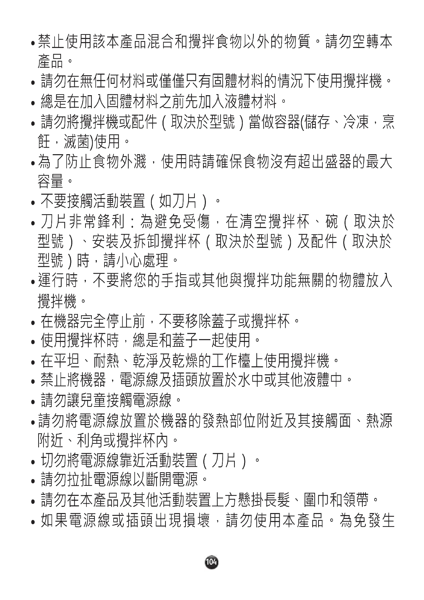 - 請勿在無任何材料或僅僅只有固體材料的情況下使用攪拌機。