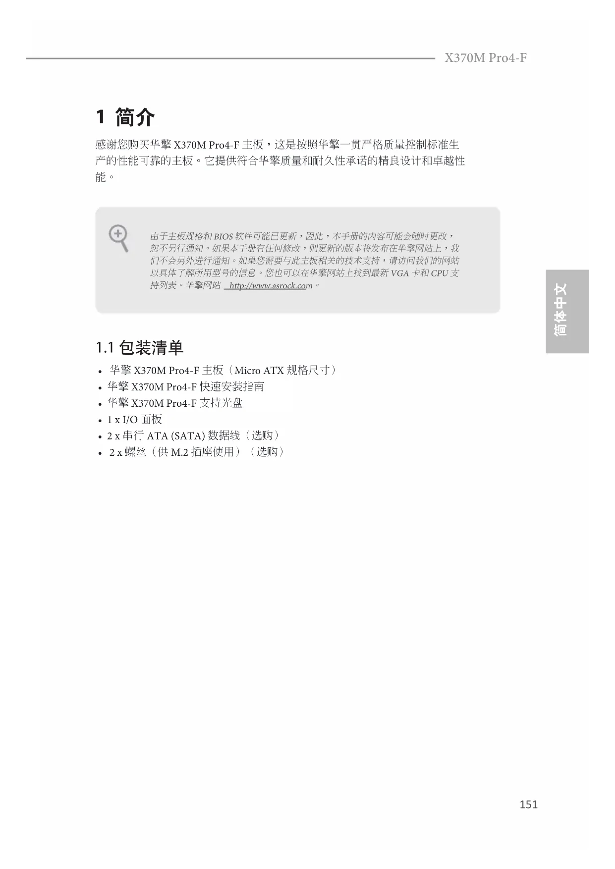 X370M Pro4-F 1 简介 感谢您购买华擎 X370M Pro4-F 主板,这是按照华擎一贯严格质量控制标准生 产的性能可靠的主板。它提供符合华擎质量和耐久性承诺的精良设计和卓越性