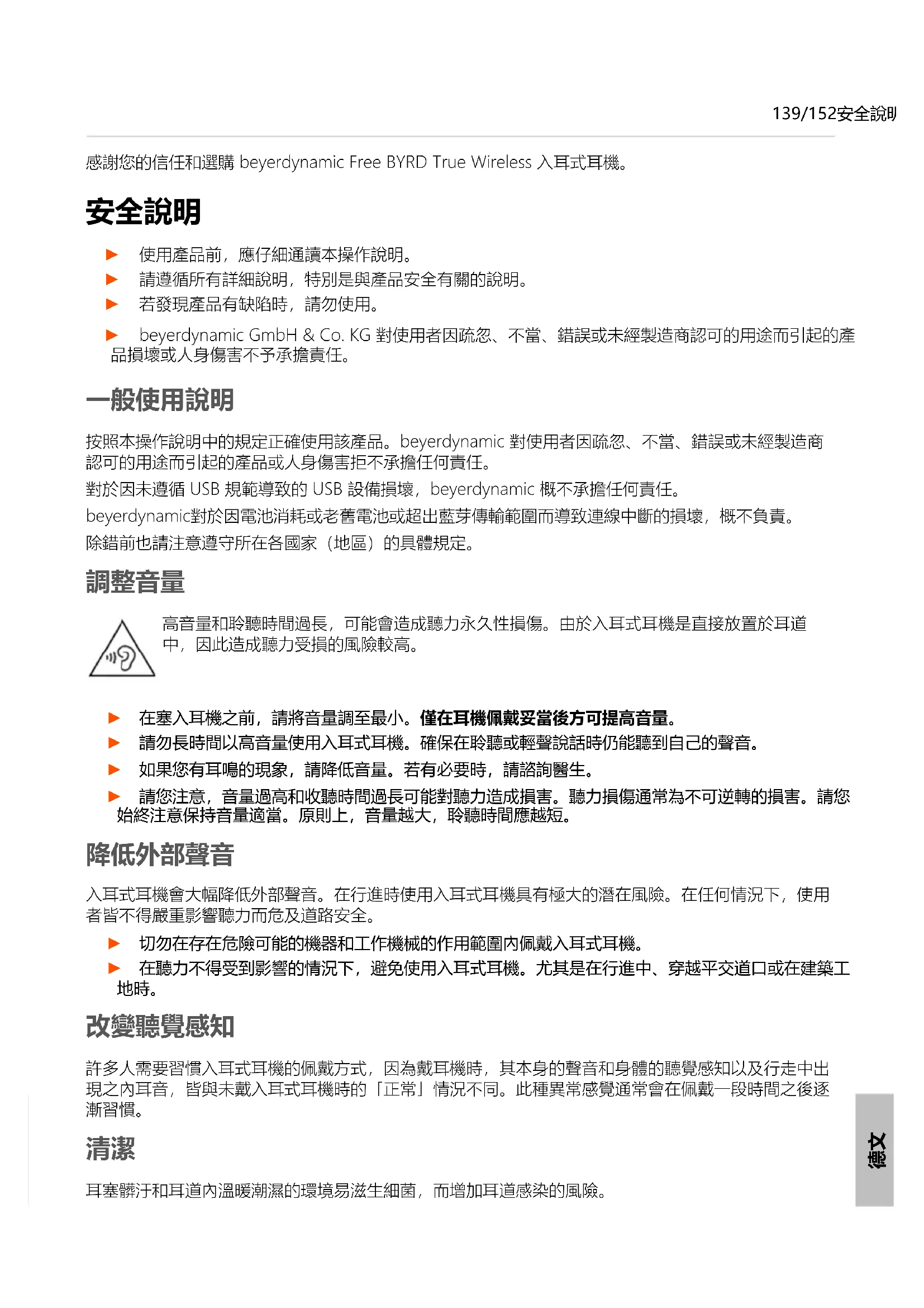 Bluetooth® 頻率範圍 2,402 – 2,480 GHz 傳輸功率 7 dBm (Bluetooth®) 2 dBm (Bluetooth® LE) 使用溫度範圍 -10 ~ +60 °C 充電溫度範圍 0 ~ +45 °C ► 透過以下網址能夠獲得關於技術指標的更多資訊:www.beyerdynamic.com。 德文152/152 保固條款