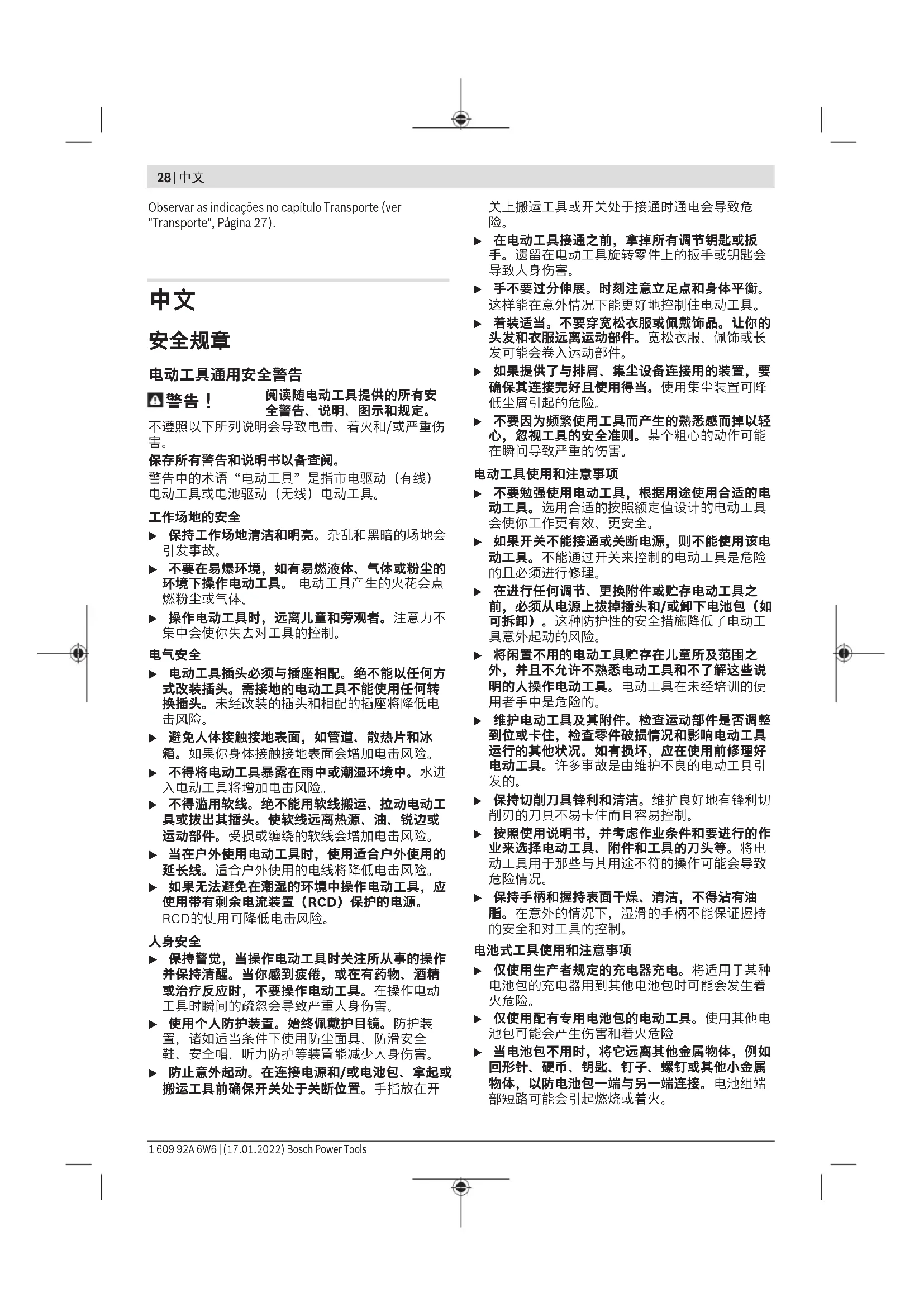 u 在电动工具上进行任何维护的工作(例如维修, 更换工具等等),以及搬运、保存电动工具之前 1 609 92A 6W6 | (17.01.2022) Bosch Power Tools中文 | 31 都必须从机器中取出蓄电池。无意间操作开关可