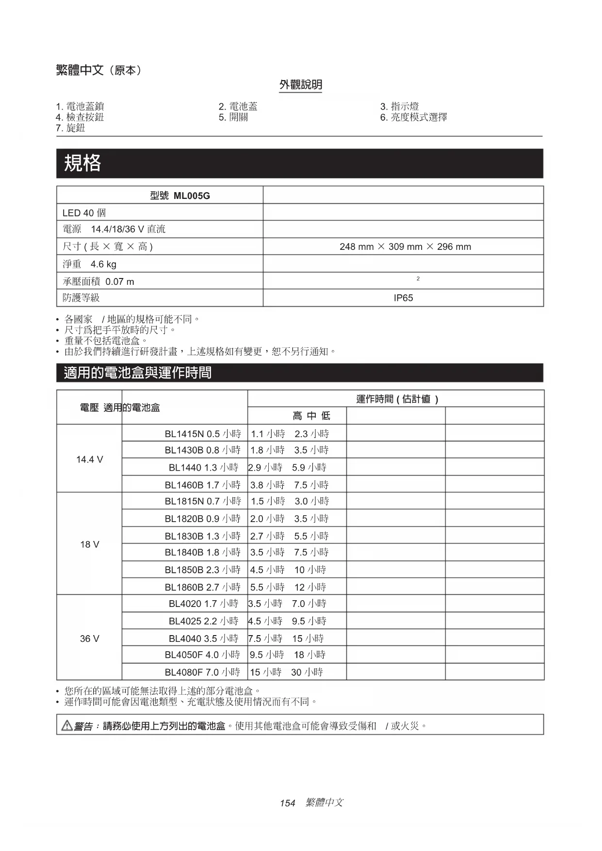 - 各國家 / 地區的規格可能不同。• 尺寸為把手平放時的尺寸。• 重量不包括電池盒。• 由於我們持續進行研發計畫,上述規格如有變更,恕不另行通知。 適用的電池盒與運作時間 電壓 適用的電池盒運作時間 ( 估計值 )高 中 低14.4 VBL1415N 0.5 小時 1.1 小時 2.3 小時BL1430B 0.8 小時 1.8 小時 3.5 小時BL1440 1.3 小時 2.9 小時 5.9 小時BL1460B 1.7 小時 3.8 小時 7.5 小時 18 V BL1815N 0.7 小時 1.5 小時 3.0 小時BL1820B 0.9 小時 2.0 小時 3.5 小時BL1830B 1.3 小時 2.7 小時 5.5 小時BL1840B 1.8 小時 3.5 小時 7.5 小時BL1850B 2.3 小時 4.5 小時 10 小時BL1860B 2.7 小時 5.5 小時 12 小時 36 V BL4020 1.7 小時 3.5 小時 7.0 小時BL4025 2.2 小時 4.5 小時 9.5 小時BL4040 3.5 小時 7.5 小時 15 小時BL4050F 4.0 小時 9.5 小時 18 小時BL4080F 7.0 小時 15 小時 30 小時• 您所在的區域可能無法取得上述的部分電池盒。• 運作時間可能會因電池類型、充電狀態及使用情況而有不同。 請務必使用上方列出的電池盒。使用其他電池盒可能會導致受傷和 / 或火災。155