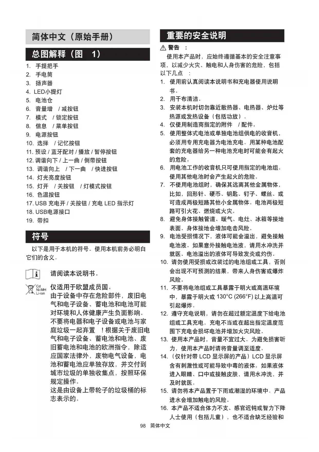- 扬声器输出 = 100mW 警告 : 仅使用上列电池盒。使用其他电池盒可引起人身伤害和 / 或火灾。