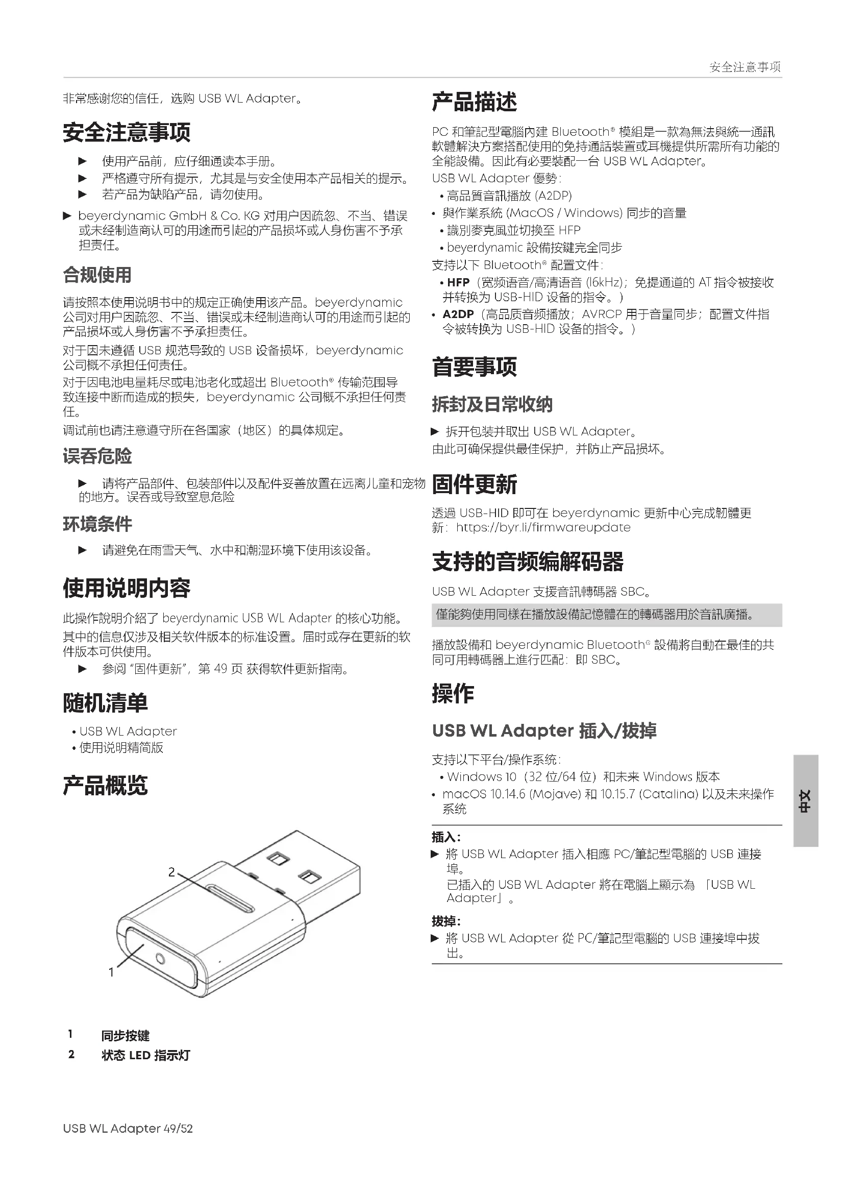 此操作說明介紹了 beyerdynamic USB WL Adapter 的核心功能。 其中的信息仅涉及相关软件版本的标准设置。届时或存在更新的软