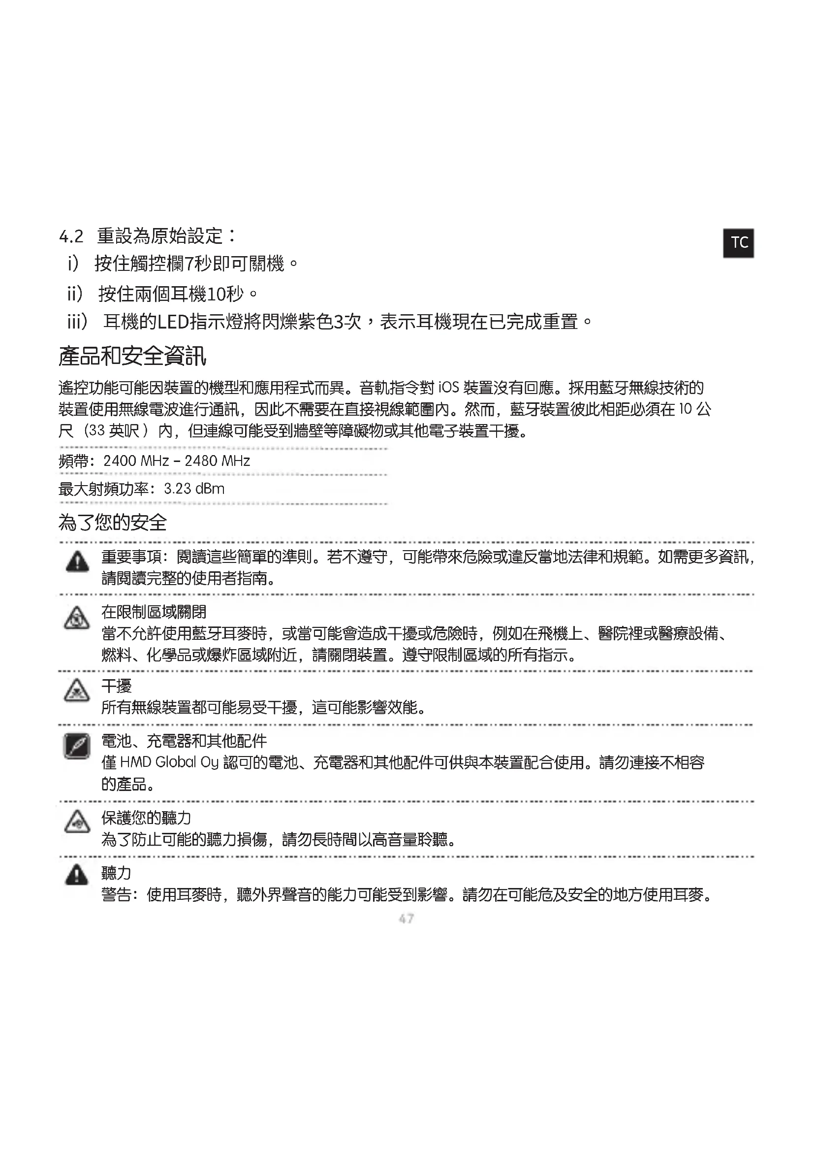 當不允許使用藍牙耳麥時,或當可能會造成干擾或危險時,例如在飛機上、醫院裡或醫療設備、燃料、化學品或爆炸區域附近,請關閉裝置。遵守限制區域的所有指示。
