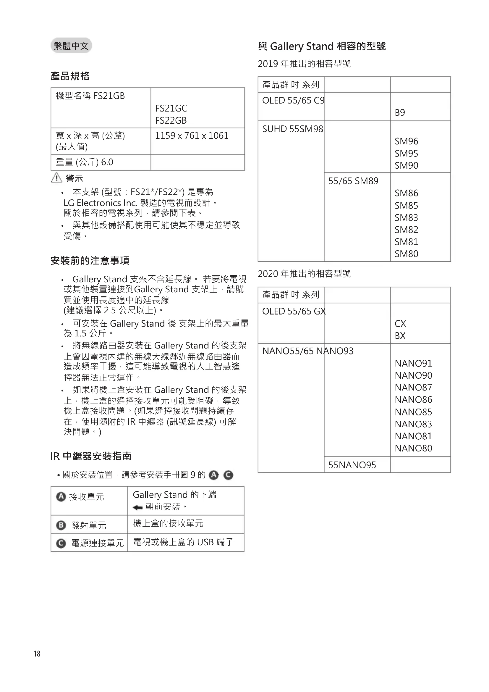 - 本支架 (型號:FS21*/FS22*) 是專為 LG Electronics Inc. 製造的電視而設計。 關於相容的電視系列,請參閱下表。