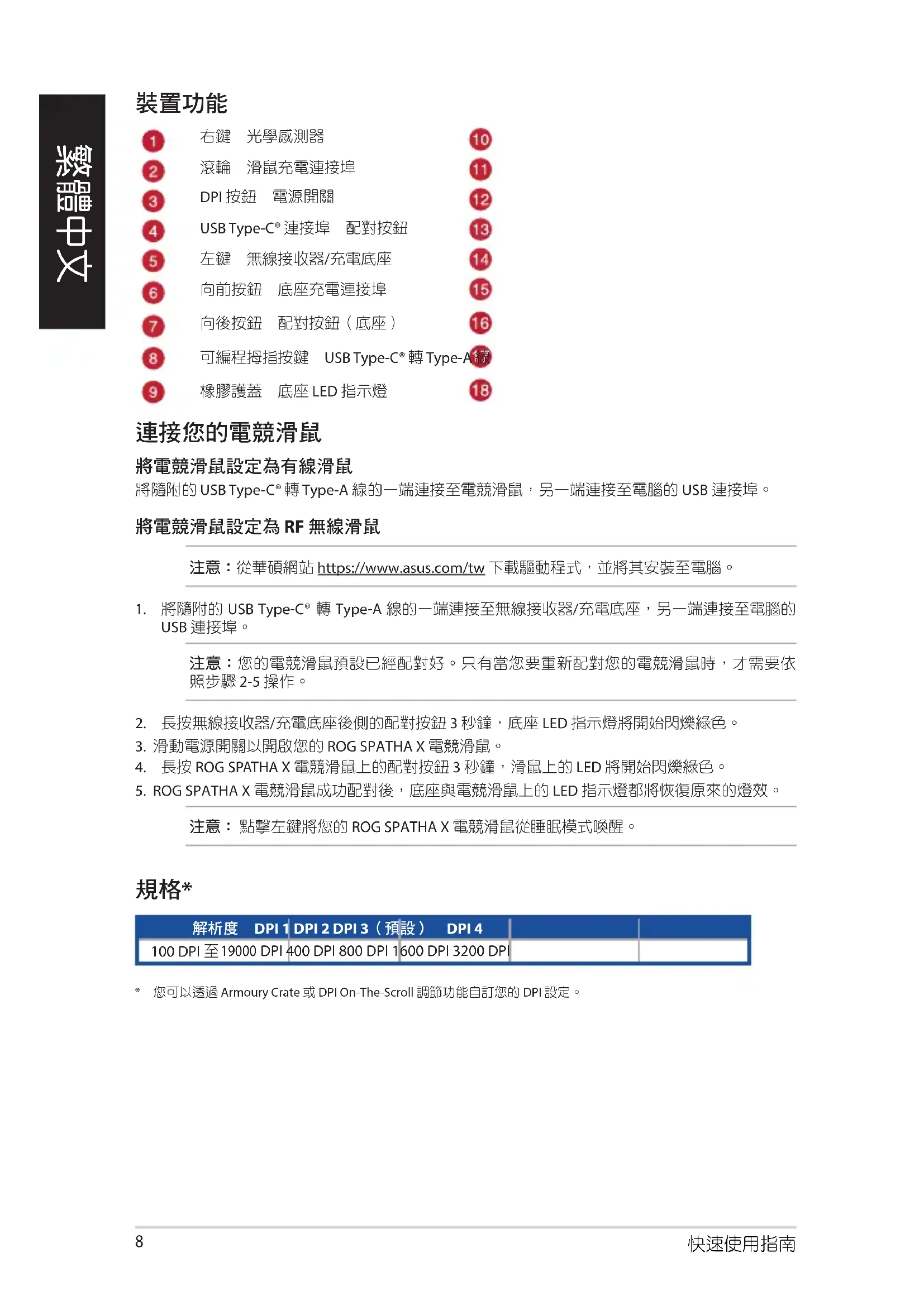 - 您可以透過 Armoury Crate 或 DPI On-The-Scroll 調節功能自訂您的 DPI 設定。繁體中文