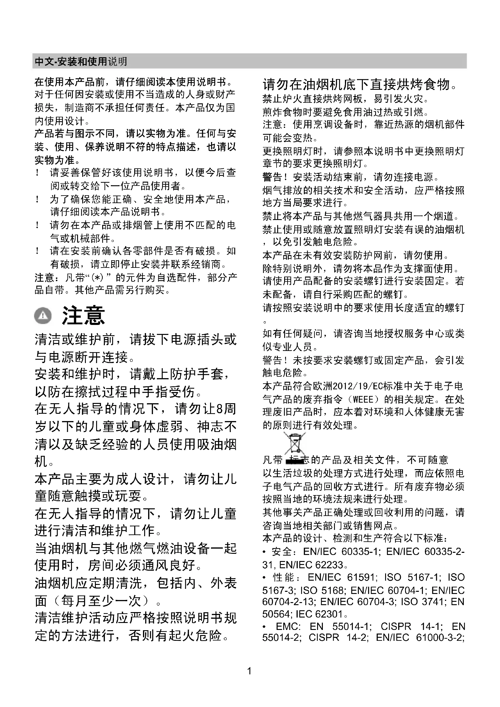 安装和维护时,请戴上防护手套, 以防在擦拭过程中手指受伤。 在无人指导的情况下,请勿让8周 岁以下的儿童或身体虚弱、神志不 清以及缺乏经验的人员使用吸油烟