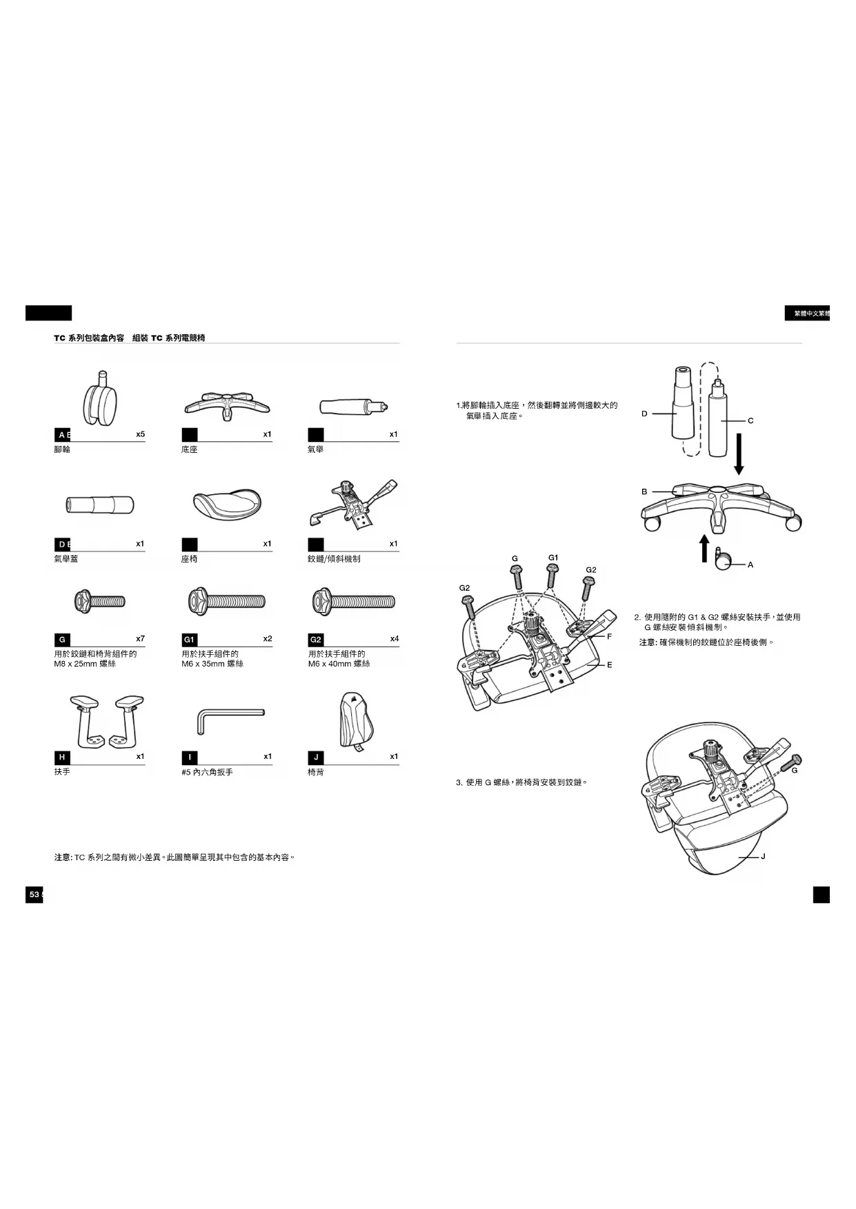 TC 系列包裝盒內容 組裝 TC 系列電競椅