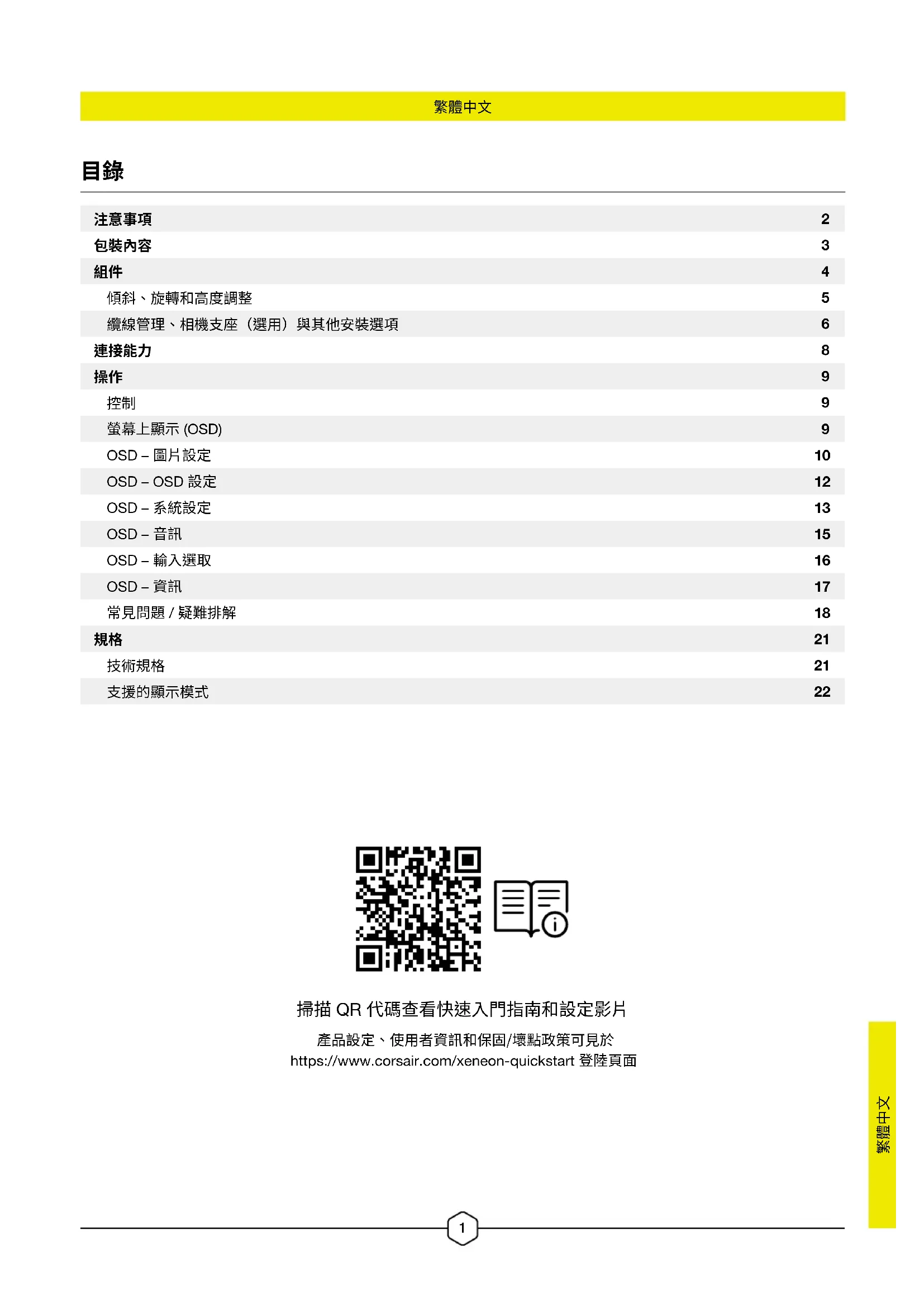 產品設定、使用者資訊和保固/壞點政策可見於 https://www.corsair.com/xeneon-quickstart 登陸頁面 掃描 QR 代碼查看快速入門指南和設定影片2