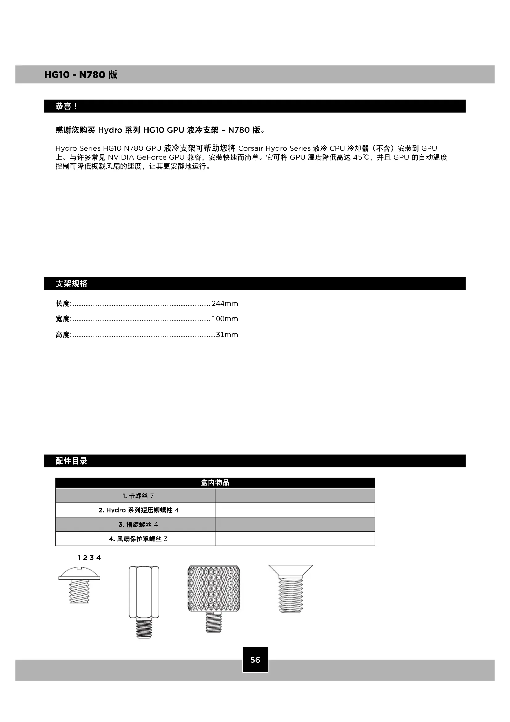 最后,用指旋螺丝固定 Hydro CPU 冷却器的安装支架。 请参阅 Hydro 系列液体 CPU 冷却器手册或 Corsair.com 上的 HG10 产品页面,了解有关安装位置的详细信息。63 HG10 - N780 版