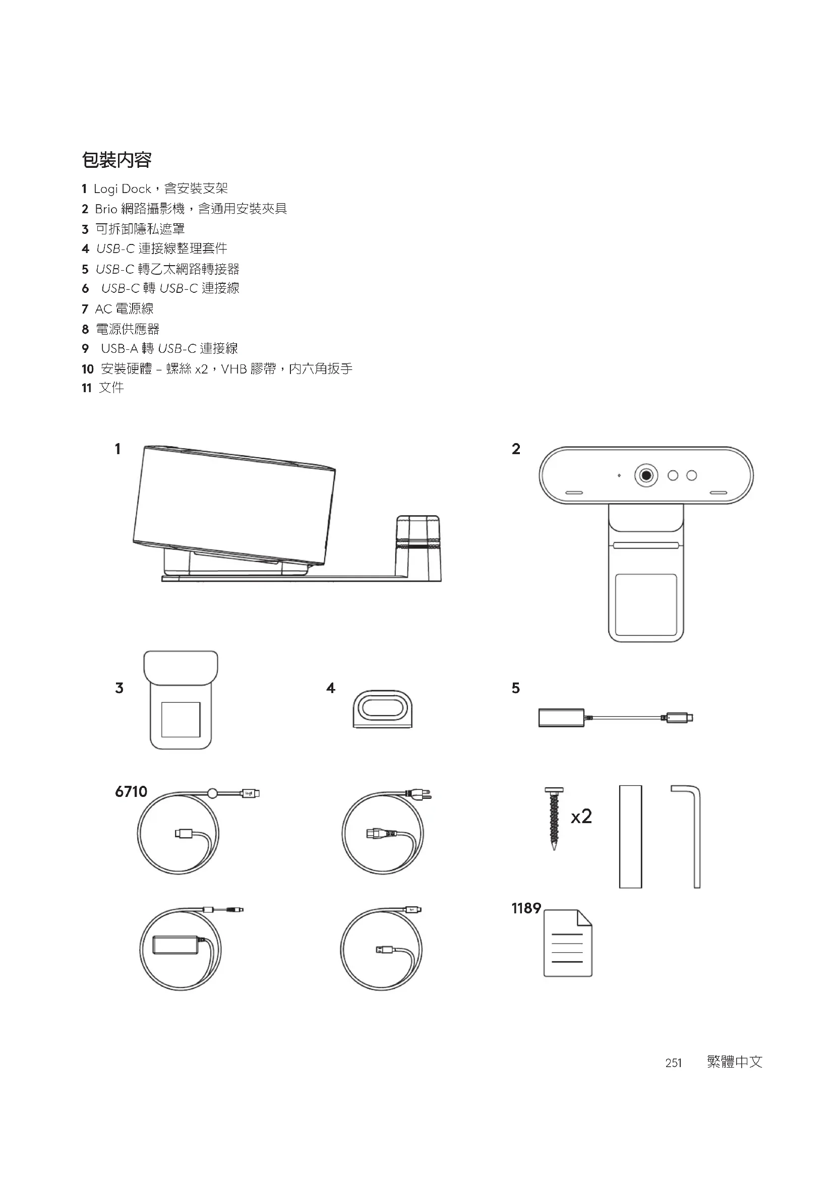 1 Logi Dock,含安裝支架 2 Brio 網路攝影機,含通用安裝夾具 3 可拆卸隱私遮罩 4 USB-C 連接線整理套件 5 USB-C 轉乙太網路轉接器 6 USB-C 轉 USB-C 連接線 7 AC 電源線 8 電源供應器 9 USB-A 轉 USB-C 連接線 10 安裝硬體 – 螺絲 x2,VHB 膠帶,內六角扳手 11 文件 251 繁體中文1 2 3