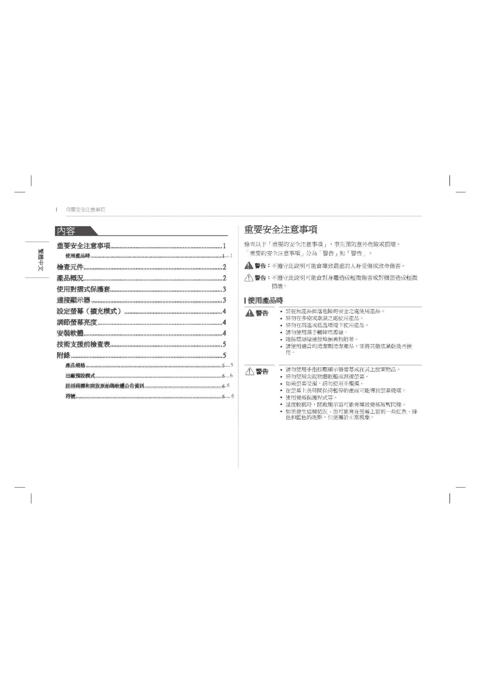 重要安全注意事項 1 使用產品時 1 檢查元件 2 產品概況 2 使用對摺式保護套 3 連接顯示器 3 設定螢幕(擴充模式) 4 調節螢幕亮度 4 安裝軟體 4 技術支援前檢查表 5 附錄 5 產品規格 5 出廠預設模式 6 註冊商標和開放原始碼軟體公告資訊 6 符號 6