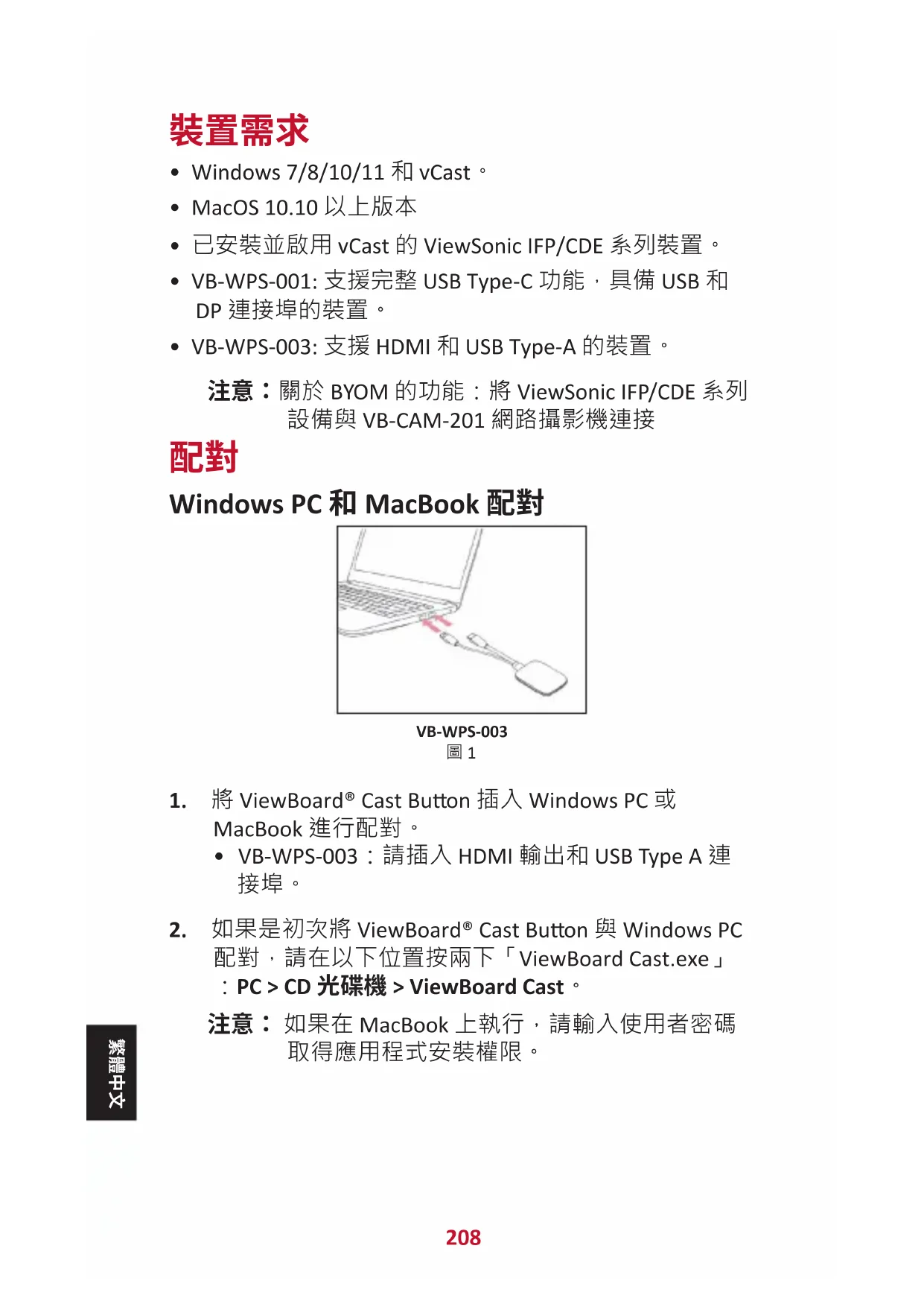 配對,請在以下位置按兩下「ViewBoard Cast.exe」 :PC > CD 光碟機 > ViewBoard Cast。 注意: 如果在 MacBook 上執行,請輸入使用者密碼 取得應用程式安裝權限。 繁體中文209