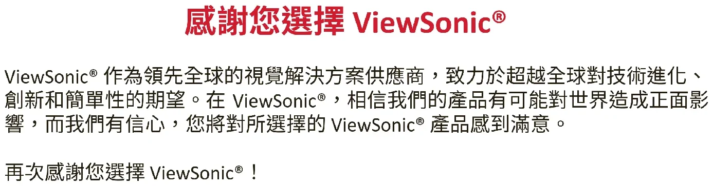 型號 VS18786 | VS18789 | VS18791 P/N: IFP6552-1C | IFP7552-1C | IFP8652-1C IFP6552-1CN | IFP7552-1CN | IFP8652-1CN IFP6552-1CF | IFP7552-1CF | IFP8652-1CF感謝您選擇 ViewSonic® ViewSonic® 作為領先全球的視覺解決方案供應商,致力於超越全球對技術進化、 創新和簡單性的期望。在 ViewSonic®,相信我們的產品有可能對世界造成正面影 響,而我們有信心,您將對所選擇的 ViewSonic® 產品感到滿意。 再次感謝您選擇 ViewSonic®!3