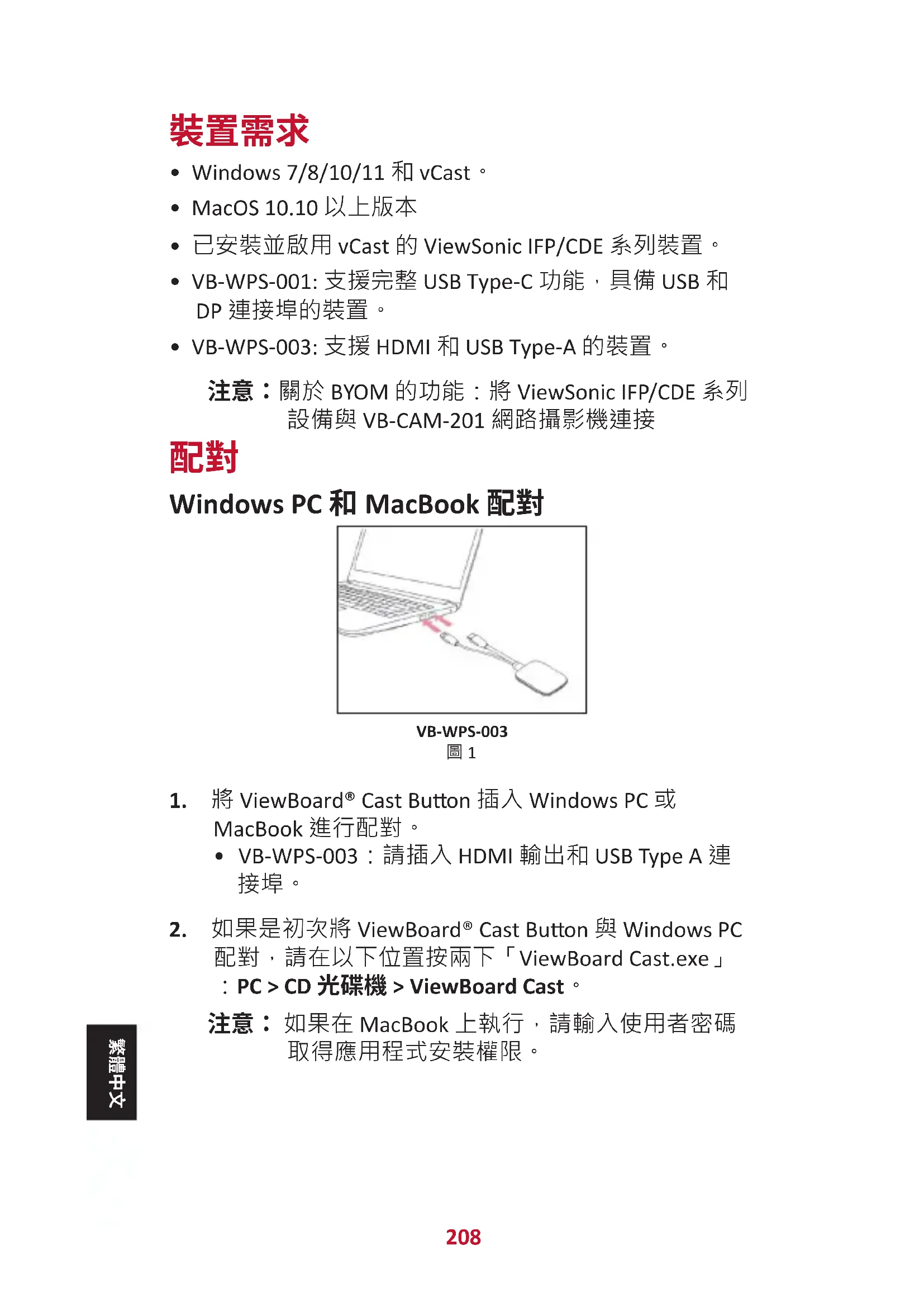 配對,請在以下位置按兩下「ViewBoard Cast.exe」 :PC > CD 光碟機 > ViewBoard Cast。 注意: 如果在 MacBook 上執行,請輸入使用者密碼 取得應用程式安裝權限。 繁體中文209
