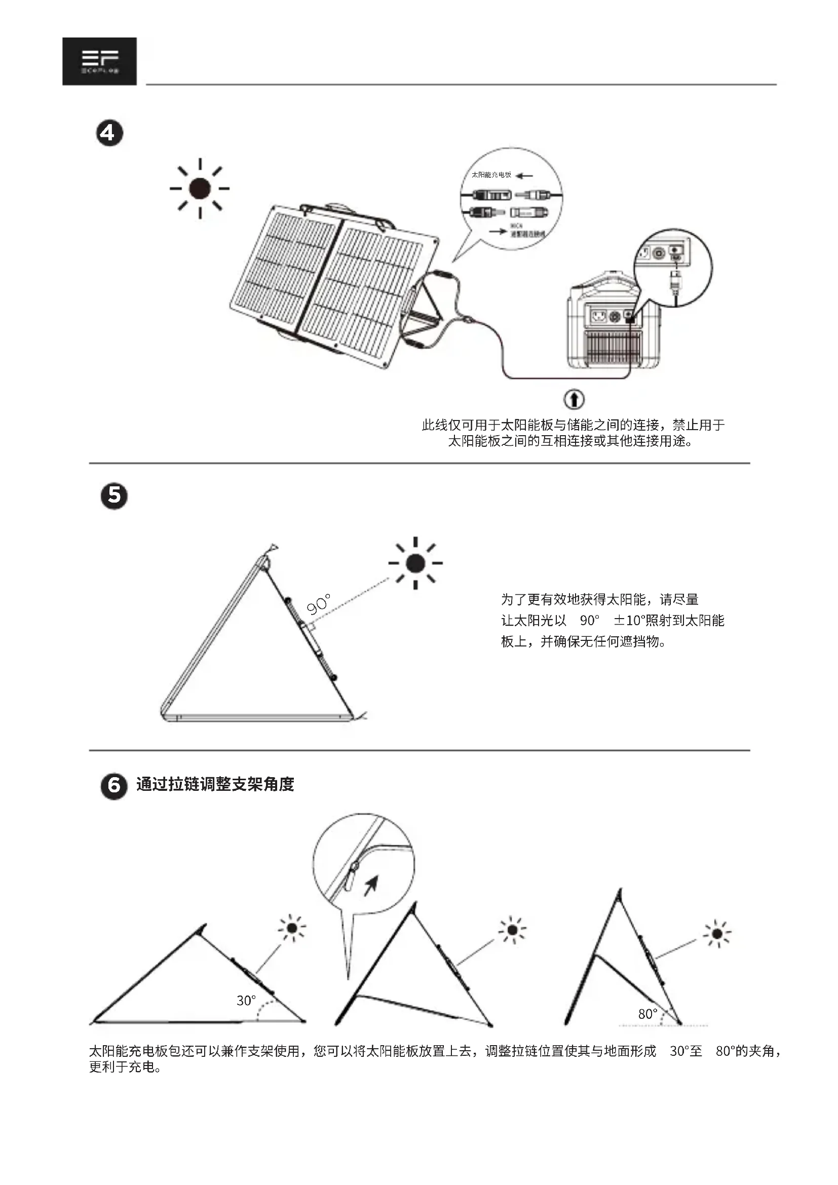 太阳能充电板包的支撑使用仅适用于10点前及14点后的太阳光线,正午时将太阳能板充电板平铺于地面即可。