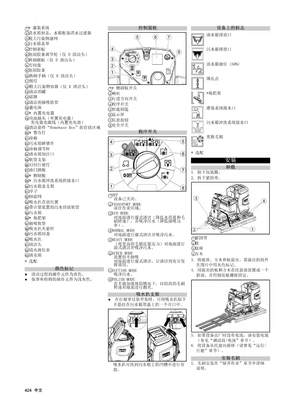 设备概览424 中文 1 * 灌装系统 2 清水箱封盖,水箱配备清水过滤器 3 粗大污染物滤网 4 污水箱盖罩 5 控制面板 6 削刮胶条调节轮(仅 D 清洁头) 7 换刷踏板(仅 D 清洁头) 8 方向盘 9 削刮胶条 10 换刷手柄(仅 R 清洁头) 11 侧灯 12 粗大污染物容器(仅 R 清洁头) 13 清洁剂罐 14 铭牌 15 清洁剂抽吸软管 16 蓄电池 17 * 内置充电器 18 电池插头(外置充电器) 充电器电源线(内置充电器) 19 清洁套件“Homebase Box”的存放区域 20 * 警告灯 21 座椅 22 污水箱解锁件 23 座椅调节杆 24 清水箱加注口 25 软管支架 26 日间行驶灯 27 油门踏板 28 * 侧刷板 29 * 污水箱冲洗系统的接水口 30 污水箱盖支架 31 浮子 32 细滤网 33 吸水扒存放位置 34 带计量装置的污水排放软管 35 污水箱 36 * 拖把架 37 抽吸软管 38 吸水扒夹紧杆 39 污水箱封盖 40 吸水扒 41 清洁头 42 清水液位表 43 清水箱