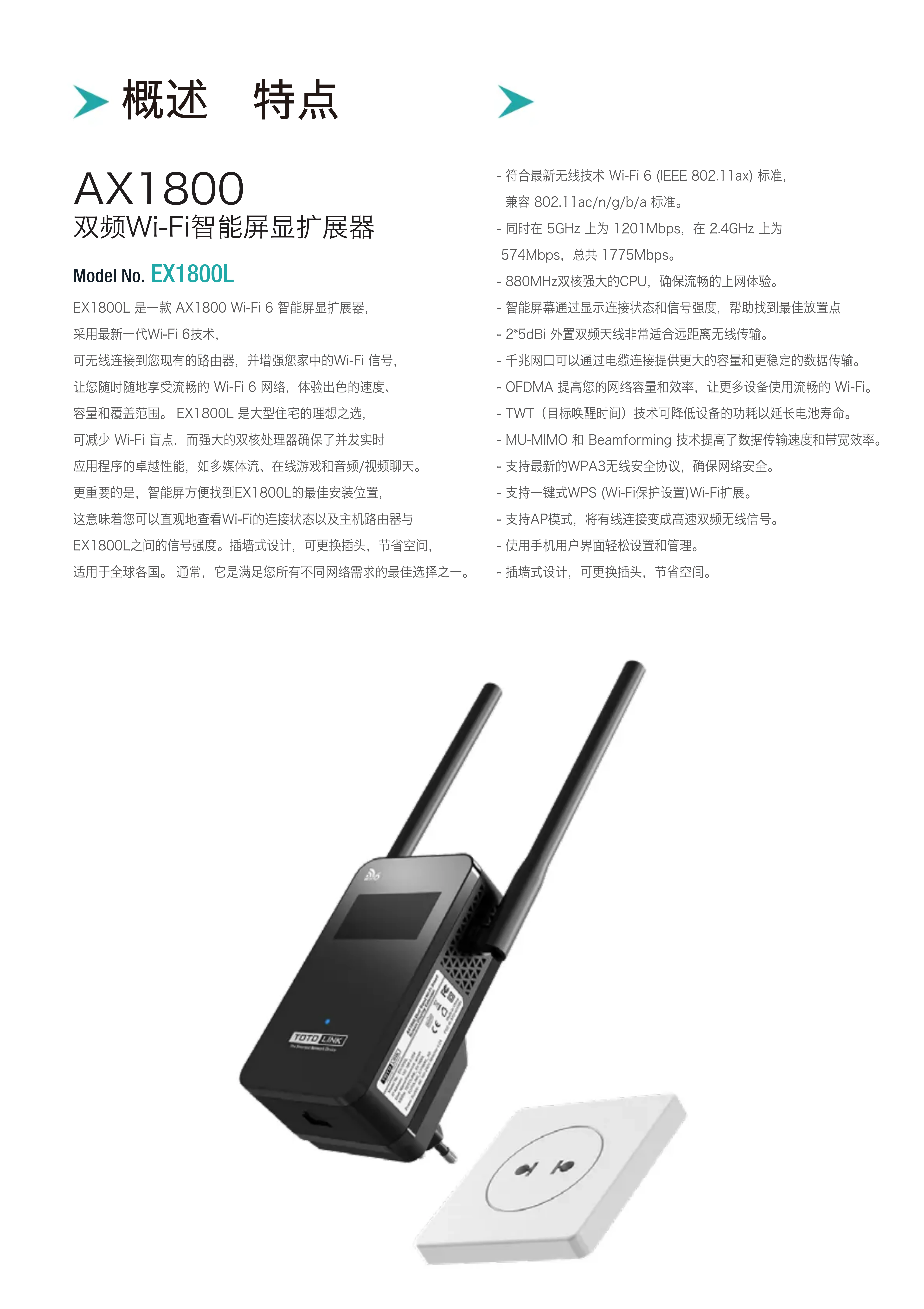 www.totolink.cn EX1800L概述 特点 Model No. EX1800L AX1800 双频Wi-Fi智能屏显扩展器 EX1800L 是一款 AX1800 Wi-Fi 6 智能屏显扩展器,采用最新一代Wi-Fi 6技术,可无线连接到您现有的路由器,并增强您家中的Wi-Fi 信号,让您随时随地享受流畅的 Wi-Fi 6 网络,体验出色的速度、容量和覆盖范围。 EX1800L 是大型住宅的理想之选,可减少 Wi-Fi 盲点,而强大的双核处理器确保了并发实时应用程序的卓越性能,如多媒体流、在线游戏和音频/视频聊天。 更重要的是,智能屏方便找到EX1800L的最佳安装位置,这意味着您可以直观地查看Wi-Fi的连接状态以及主机路由器与EX1800L之间的信号强度。插墙式设计,可更换插头,节省空间,适用于全球各国。 通常,它是满足您所有不同网络需求的最佳选择之一。- 符合最新无线技术 Wi-Fi 6 (IEEE 802.11ax) 标准, 兼容 802.11ac/n/g/b/a 标准。- 同时在 5GHz 上为 1201Mbps,在 2.4GHz 上为 574Mbps,总共 1775Mbps。- 880MHz双核强大的CPU,确保流畅的上网体验。- 智能屏幕通过显示连接状态和信号强度,帮助找到最佳放置点- 2*5dBi 外置双频天线非常适合远距离无线传输。- 千兆网口可以通过电缆连接提供更大的容量和更稳定的数据传输。- OFDMA 提高您的网络容量和效率,让更多设备使用流畅的 Wi-Fi。- TWT(目标唤醒时间)技术可降低设备的功耗以延长电池寿命。- MU-MIMO 和 Beamforming 技术提高了数据传输速度和带宽效率。- 支持最新的WPA3无线安全协议,确保网络安全。- 支持一键式WPS (Wi-Fi保护设置)Wi-Fi扩展。- 支持AP模式,将有线连接变成高速双频无线信号。- 使用手机用户界面轻松设置和管理。- 插墙式设计,可更换插头,节省空间。LAN port Router