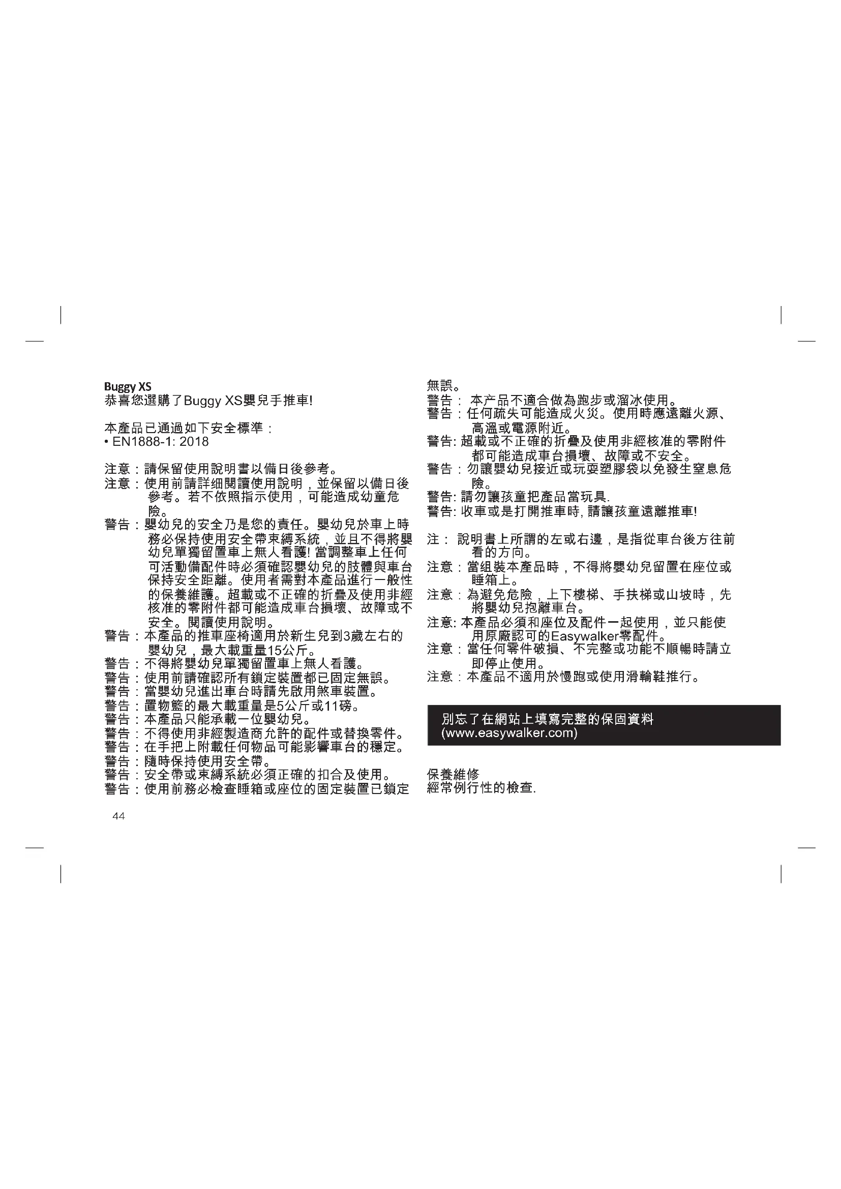 Buggy XS 恭喜您選購了Buggy XS嬰兒手推車! 本產品已通過如下安全標準: EN1888-1: 2018 注意:請保留使用說明書以備日後參考。 注意:使用前請詳細閱讀使用說明,並保留以備日後參 考。若不依照指示使用,可能造成幼童危險。 警告:嬰幼兒的安全乃是您的責任。嬰幼兒於車上時務 必保持使用安全帶束縛系統,並且不得將嬰幼 兒單獨留置車上無人看護! 當調整車上任何可 活動備配件時必須確認嬰幼兒的肢體與車台保 持安全距離。使用者需對本產品進行一般性的 保養維護。超載或不正確的折疊及使用非經核 准的零附件都可能造成車台損壞、故障或不安