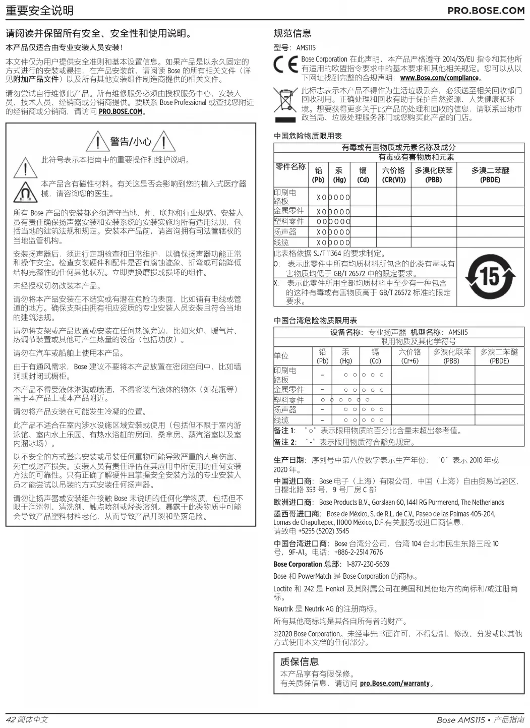 有关质保信息,请访问pro.Bose.com/warranty。