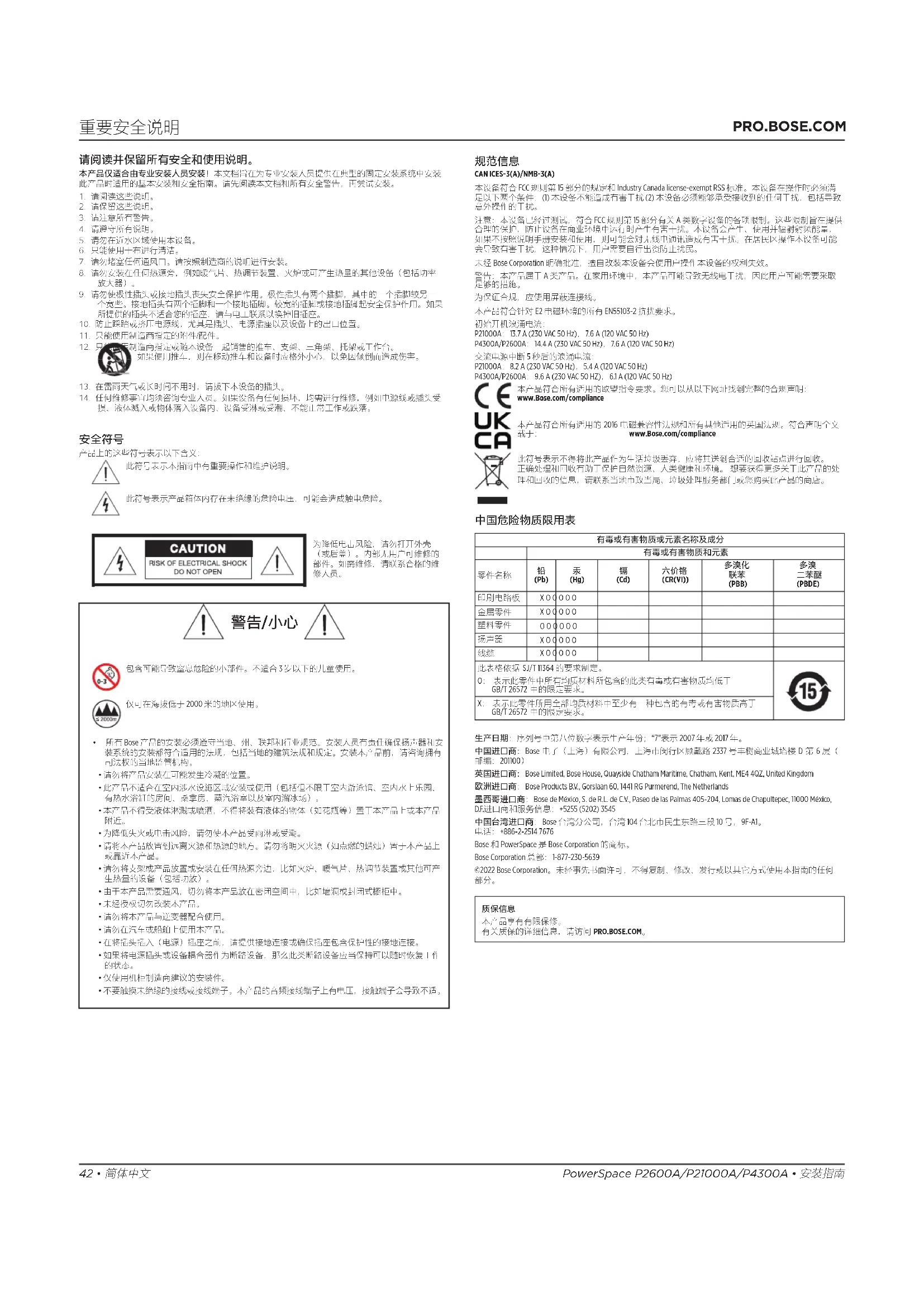 CAN ICES-3(A)/NMB-3(A) 本设备符合 FCC 规则第 15 部分的规定和 Industry Canada license-exempt RSS 标准。本设备在操作时必须满 足以下两个条件:(1) 本设备不能造成有害干扰 (2) 本设备必须能够承受接收到的任何干扰,包括导致意外操作的干扰。 注意:本设备已经过测试,符合 FCC 规则第 15 部分有关 A 类数字设备的各项限制。这些限制旨在提供 合理的保护,防止设备在商业环境中运行时产生有害干扰。本设备会产生、使用并辐射射频能量,如果不按照说明手册安装和使用,则可能会对无线电通讯造成有害干扰。在居民区操作本设备可能会导致有害干扰,这种情况下,用户需要自行出资防止扰民。未经 Bose Corporation 明确批准,擅自改装本设备会使用户操作本设备的权利失效。警告:本产品属于 A 类产品。在家用环境中,本产品可能导致无线电干扰,因此用户可能需要采取足够的措施。为保证合规,应使用屏蔽连接线。本产品符合针对 E2 电磁环境的所有 EN55103-2 抗扰要求。初始开机浪涌电流: P21000A:13.7 A (230 VAC 50 Hz),7.6 A (120 VAC 50 Hz) P4300A/P2600A:14.4 A (230 VAC 50 Hz),7.6 A (120 VAC 50 Hz) 交流电源中断 5 秒后的浪涌电流: P21000A:8.2 A (230 VAC 50 Hz),5.4 A (120 VAC 50 Hz) P4300A/P2600A:9.6 A (230 VAC 50 HZ),6.1 A (120 VAC 50 Hz) 本产品符合所有适用的欧盟指令要求。您可以从以下网址找到完整的合规声明: www.Bose.com/compliance本产品符合所有适用的 2016 电磁兼容性法规和所有其他适用的英国法规。符合声明全文载于:www.Bose.com/compliancewww.Bose.com/compliance此符号表示不得将此产品作为生活垃圾丢弃,应将其送到合适的回收站点进行回收。 正确处理和回收有助于保护自然资源、人类健康和环境。 想要获得更多关于此产品的处理和回收的信息,请联系当地市政当局、垃圾处理服务部门或您购买此产品的商店。 有毒或有害物质或元素名称及成分有毒或有害物质和元素