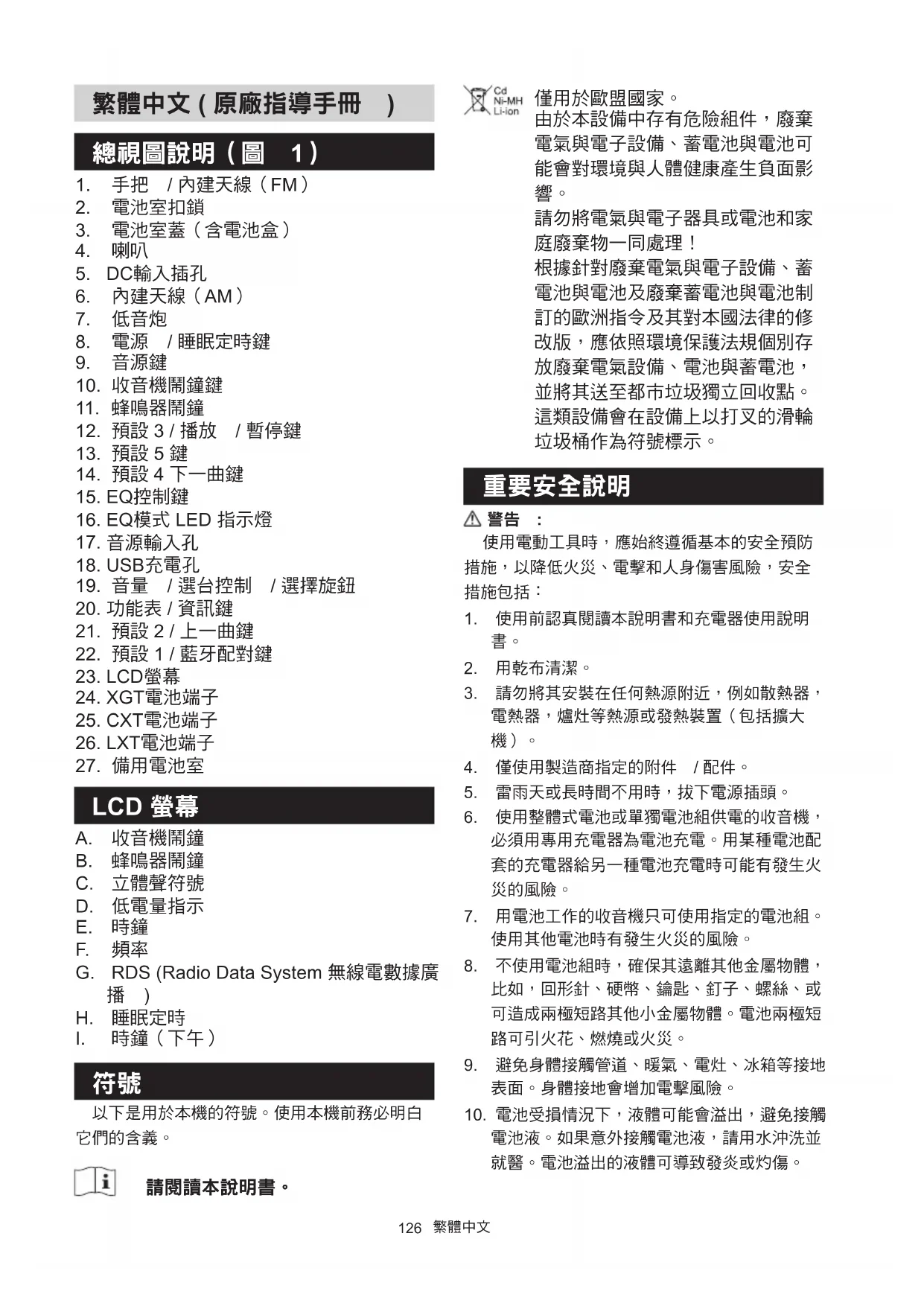 用電池工作的收音機只可使用指定的電池組。 使用其他電池時有發生火災的風險。
