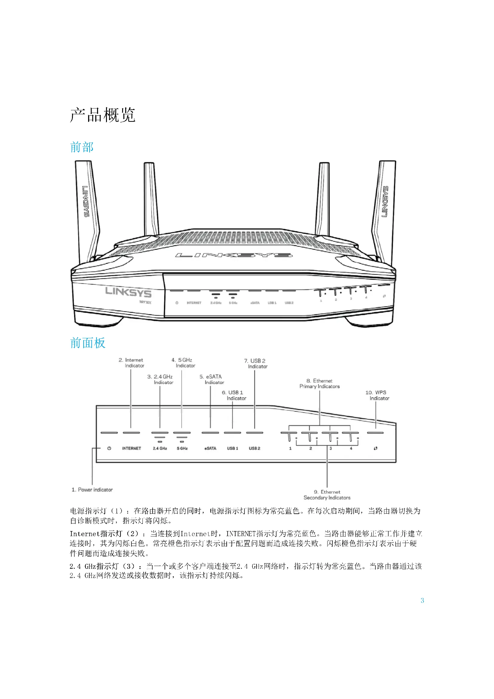电源指示灯(1):在路由器开启的同时,电源指示灯图标为常亮蓝色。在每次启动期间,当路由器切换为 自诊断模式时,指示灯将闪烁。 Internet指示灯(2) :当连接到Internet时,INTERNET指示灯为常亮蓝色。当路由器能够正常工作并建立 连接时,其为闪烁白色。常亮橙色指示灯表示由于配置问题而造成连接失败。闪烁橙色指示灯表示由于硬 件问题而造成连接失败。