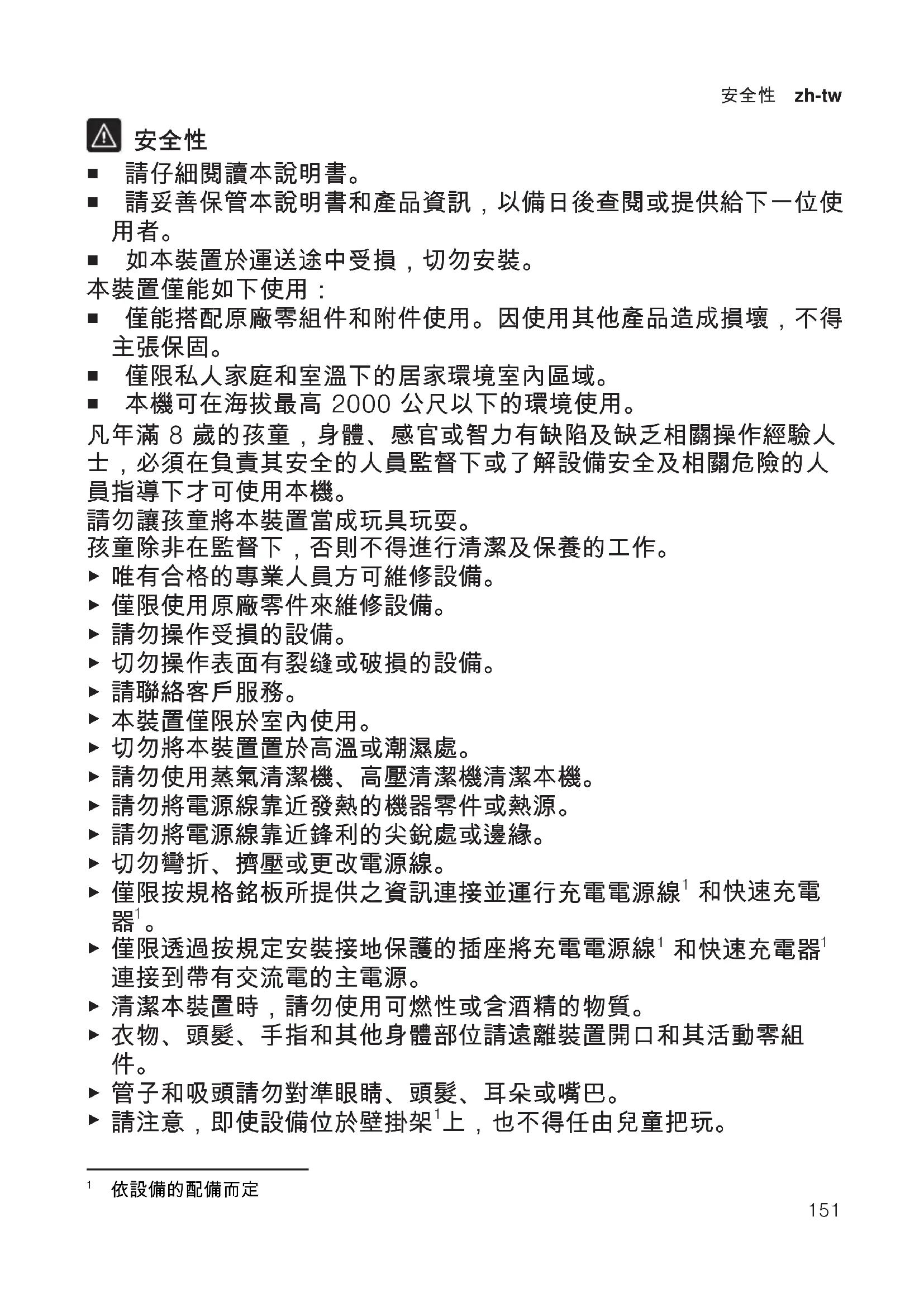 ¡ 僅限私人家庭和室溫下的居家環境室內區域。 ¡ 本機可在海拔最高 2000 公尺以下的環境使用。 凡年滿 8 歲的孩童,身體、感官或智力有缺陷及缺乏相關操作經驗人 士,必須在負責其安全的人員監督下或了解設備安全及相關危險的人 員指導下才可使用本機。 請勿讓孩童將本裝置當成玩具玩耍。 孩童除非在監督下,否則不得進行清潔及保養的工作。