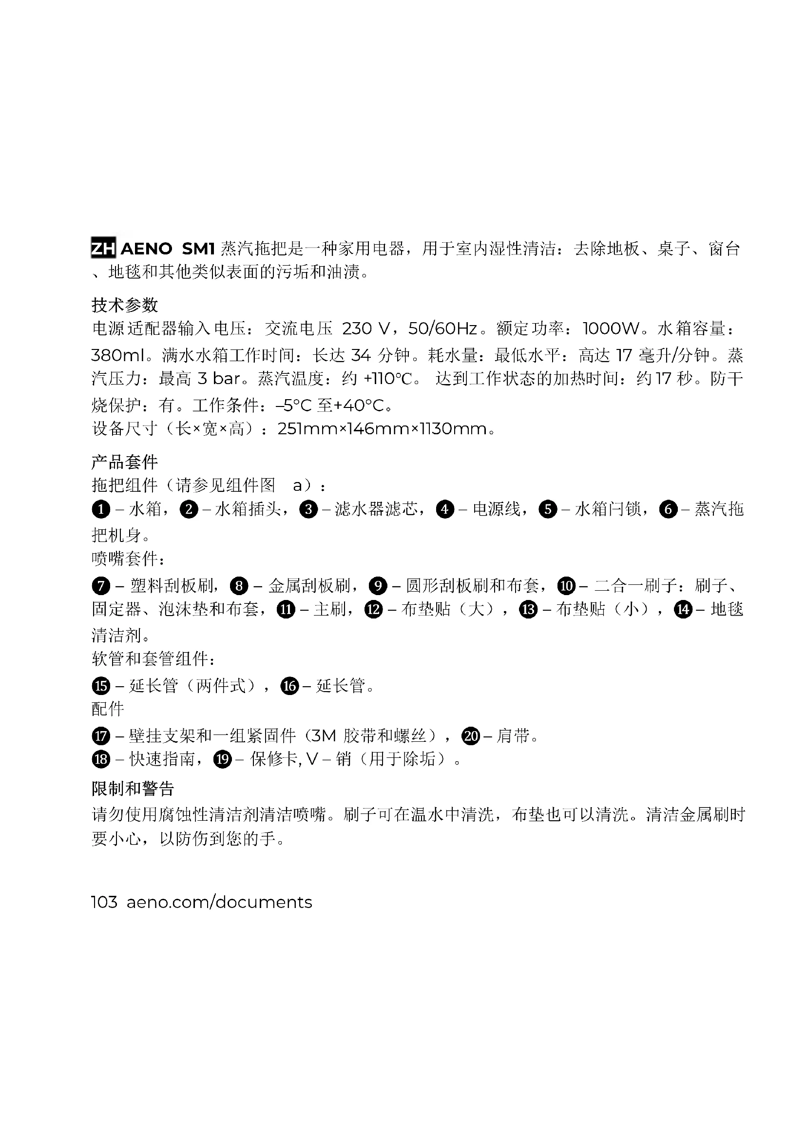 请勿使用腐蚀性清洁剂清洁喷嘴。刷子可在温水中清洗,布垫也可以清洗。清洁金属刷时 要小心,以防伤到您的手。aeno.com/documents 104 确保电源电压与蒸汽拖把技术参数中规定的电压相同。请将蒸汽拖把从电网上取下后再清 洗。断开电源时,请拉插头的塑料部分,而不要拉电源线。为减少起火的危险,请勿将蒸 汽拖把浸入水中或放在加热器附近。如果发现外壳损坏,听到奇怪的声音、爆裂声或电源 线断裂,请勿再使用蒸汽拖把。请勿在耐热性差的表面(低于+100 °C)使用拖把清洁。 为避免受伤,请勿冲人喷洒热气。切勿拆卸拖把。不要在户外使用拖把。