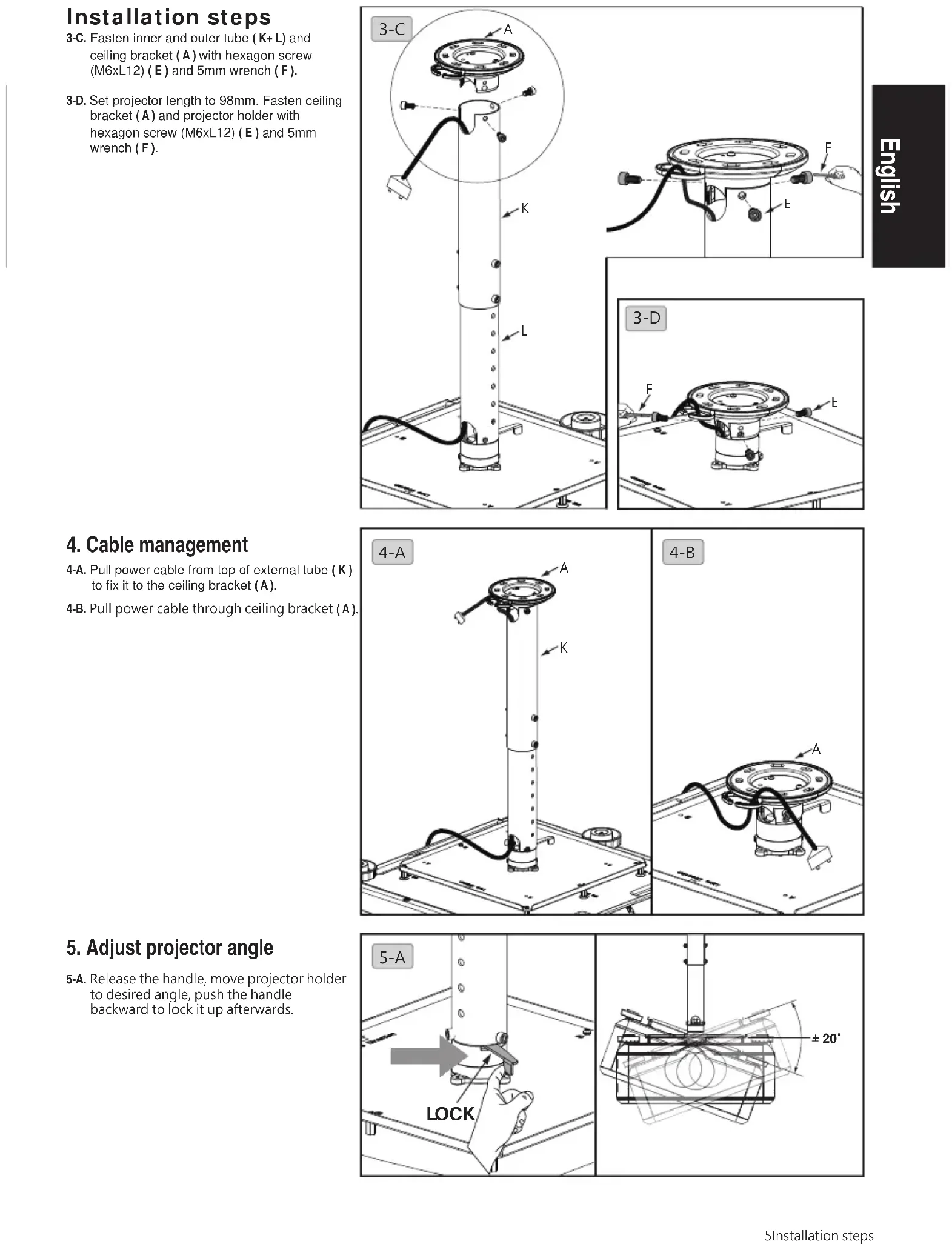 5.調整所需角度 5-A.將把手鬆開,可調整投影機吊架所需的角度, 調整完所需的角度後,再將把手往後推,鎖緊。4-A.將電源線由外管( K )上方拉出,固定在天花板托架 ( A )上。 4.電纜管理 4-B.將電源線穿過天花板托架( A )上。 LOCK 20˚