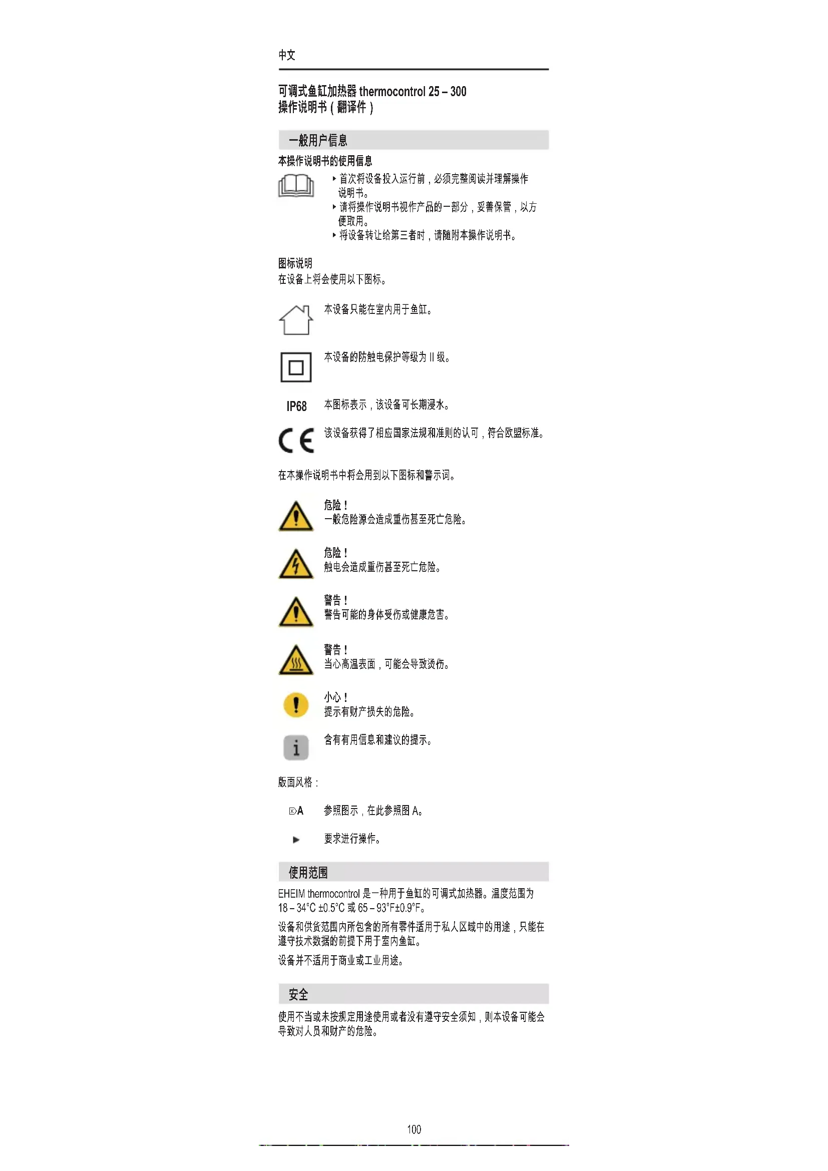 在设备上将会使用以下图标。 本设备只能在室内用于鱼缸。 本设备的防触电保护等级为 II 级。 IP68 本图标表示,该设备可长期浸水。 该设备获得了相应国家法规和准则的认可,符合欧盟标准。 在本操作说明书中将会用到以下图标和警示词。