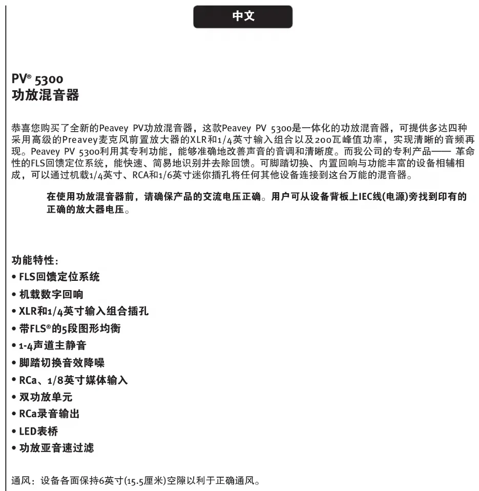 恭喜您购买了全新的Peavey PV功放混音器,这款Peavey PV 5300是一体化的功放混音器,可提供多达四种采用高级的Preavey麦克风前置放大器的XLR和1/4英寸输入组合以及200瓦峰值功率,实现清晰的音频再现。Peavey PV 5300利用其专利功能,能够准确地改善声音的音调和清晰度。而我公司的专利产品——革命性的FLS回馈定位系统,能快速、简易地识别并去除回馈。可脚踏切换、内置回响与功能丰富的设备相辅相成,可以通过机载1/4英寸、RCA和1/6英寸迷你插孔将任何其他设备连接到这台万能的混音器。