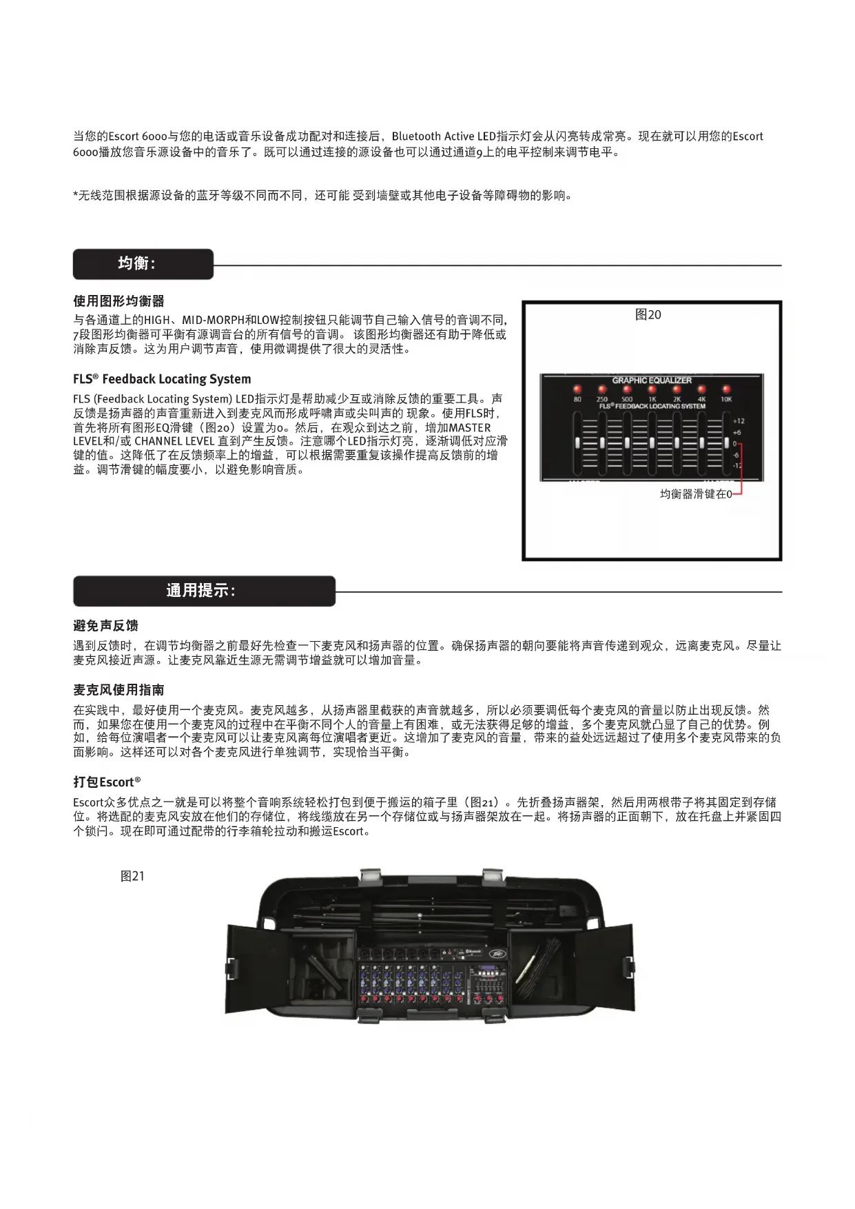 (反馈定位系统)的主7段图形EQ。手提箱为麦克风、线缆和其他选配件提供了额 外的存储空间。Escort箱上有供固定扬声器的锁闩、各种便于搬运选配件的手柄以及为搬运提供便利的滚轮。请仔细阅读本 说明,祝您愉快地享用这款新百威Escort 6000。